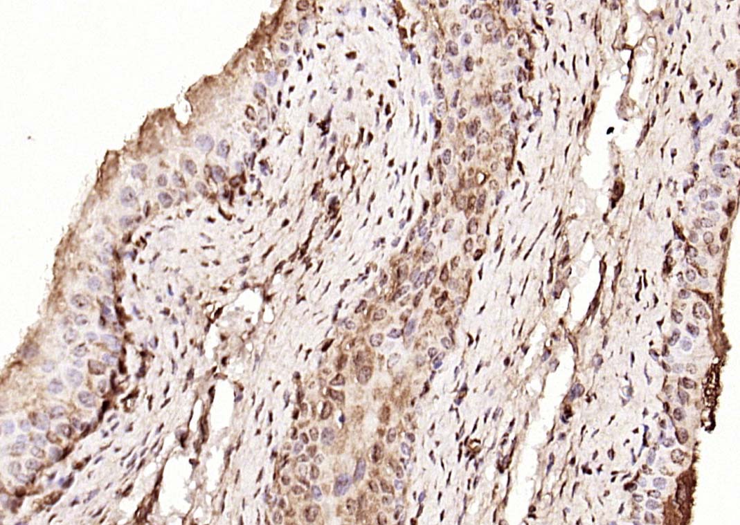 Paraformaldehyde-fixed, paraffin embedded (human cervical carcinoma); Antigen retrieval by boiling in sodium citrate buffer (pH6.0) for 15min; Block endogenous peroxidase by 3% hydrogen peroxide for 20 minutes; Blocking buffer (normal goat serum) at 37°C for 30min; Antibody incubation with (Phospho-NFKB1 (Ser893)) Polyclonal Antibody, Unconjugated (bs-5513R) at 1:200 overnight at 4°C, followed by operating according to SP Kit(Rabbit) (sp-0023) instructionsand DAB staining.