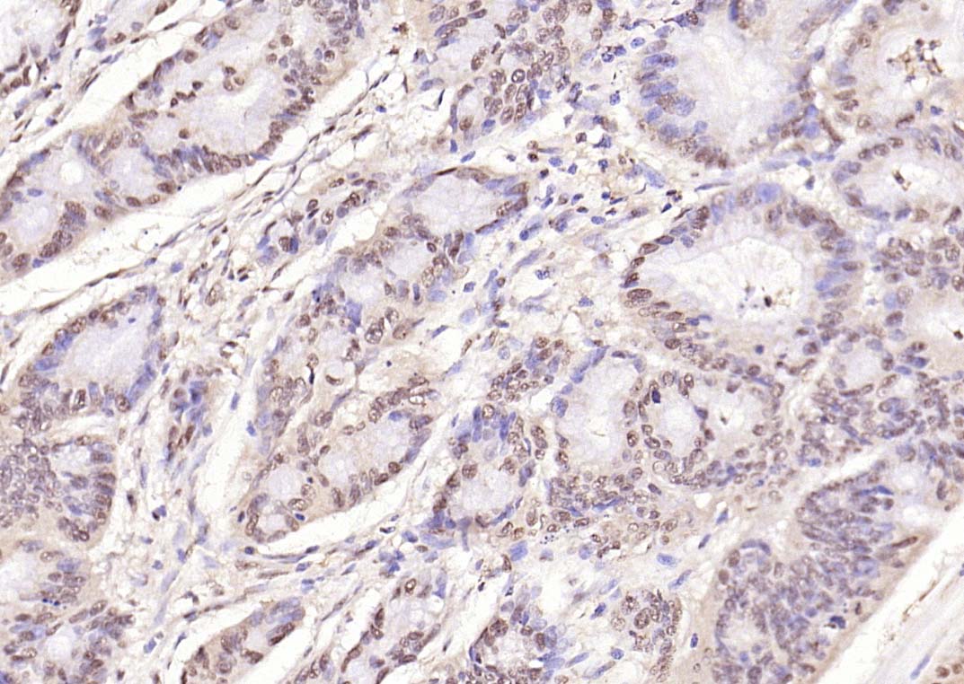 Paraformaldehyde-fixed, paraffin embedded (human rectal carcinoma); Antigen retrieval by boiling in sodium citrate buffer (pH6.0) for 15min; Block endogenous peroxidase by 3% hydrogen peroxide for 20 minutes; Blocking buffer (normal goat serum) at 37°C for 30min; Antibody incubation with (Phospho-NFKB1 (Ser893)) Polyclonal Antibody, Unconjugated (bs-5513R) at 1:200 overnight at 4°C, followed by operating according to SP Kit(Rabbit) (sp-0023) instructionsand DAB staining.