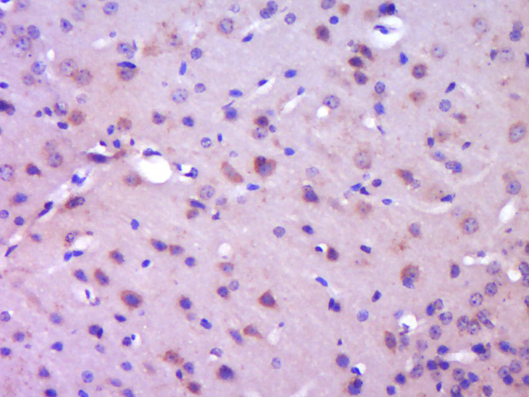 Paraformaldehyde-fixed, paraffin embedded (Mouse brain); Antigen retrieval by boiling in sodium citrate buffer (pH6.0) for 15min; Block endogenous peroxidase by 3% hydrogen peroxide for 20 minutes; Blocking buffer (normal goat serum) at 37°C for 30min; Antibody incubation with (p-IKB alpha (Tyr42)) Polyclonal Antibody, Unconjugated (bs-5514R) at 1:400 overnight at 4°C, followed by operating according to SP Kit(Rabbit) (sp-0023) instructionsand DAB staining.