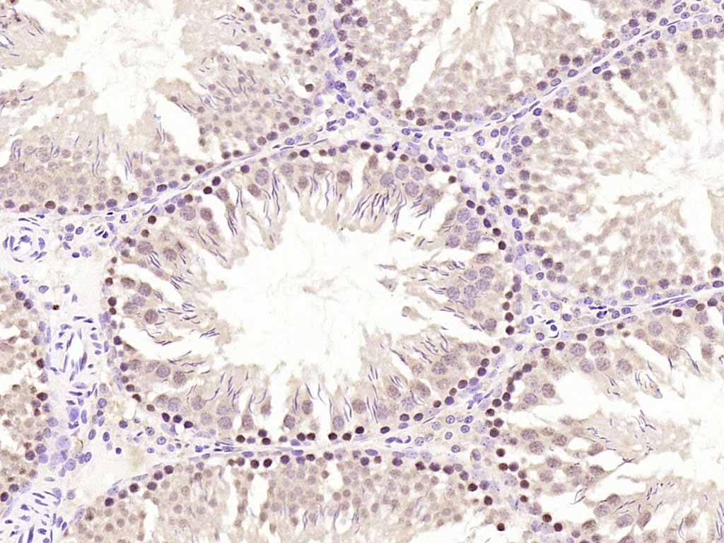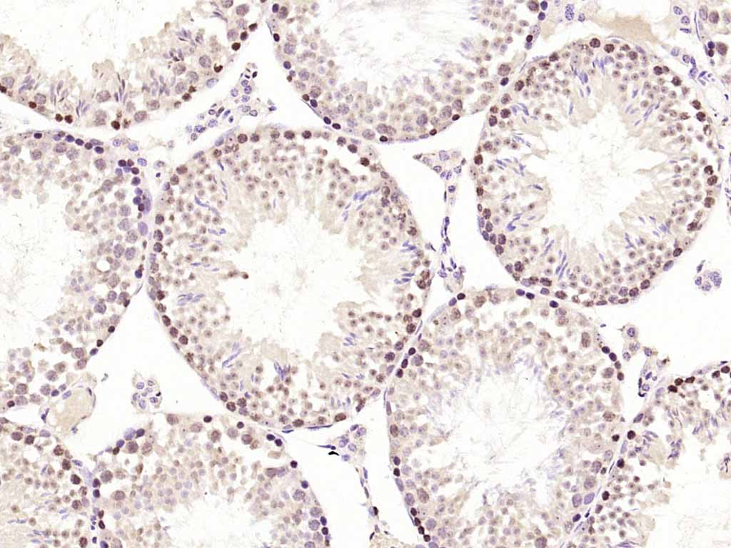 Paraformaldehyde-fixed, paraffin embedded (mouse testis); Antigen retrieval by boiling in sodium citrate buffer (pH6.0) for 15min; Block endogenous peroxidase by 3% hydrogen peroxide for 20 minutes; Blocking buffer (normal goat serum) at 37°C for 30min; Antibody incubation with (phospho-PKC delta (Ser645)) Polyclonal Antibody, Unconjugated (bs-5559R) at 1:200 overnight at 4°C, followed by operating according to SP Kit(Rabbit) (sp-0023) instructionsand DAB staining.