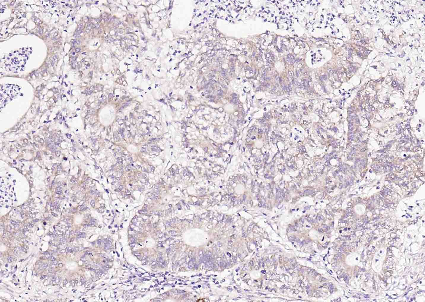 Paraformaldehyde-fixed, paraffin embedded (human colon carcinoma); Antigen retrieval by boiling in sodium citrate buffer (pH6.0) for 15min; Block endogenous peroxidase by 3% hydrogen peroxide for 20 minutes; Blocking buffer (normal goat serum) at 37°C for 30min; Incubation with (phospho-PRKD1) Polyclonal Antibody, Unconjugated (bs-5561R) at 1:200 overnight at 4°C, followed by operating according to SP Kit(Rabbit) (sp-0023) instructionsand DAB staining.