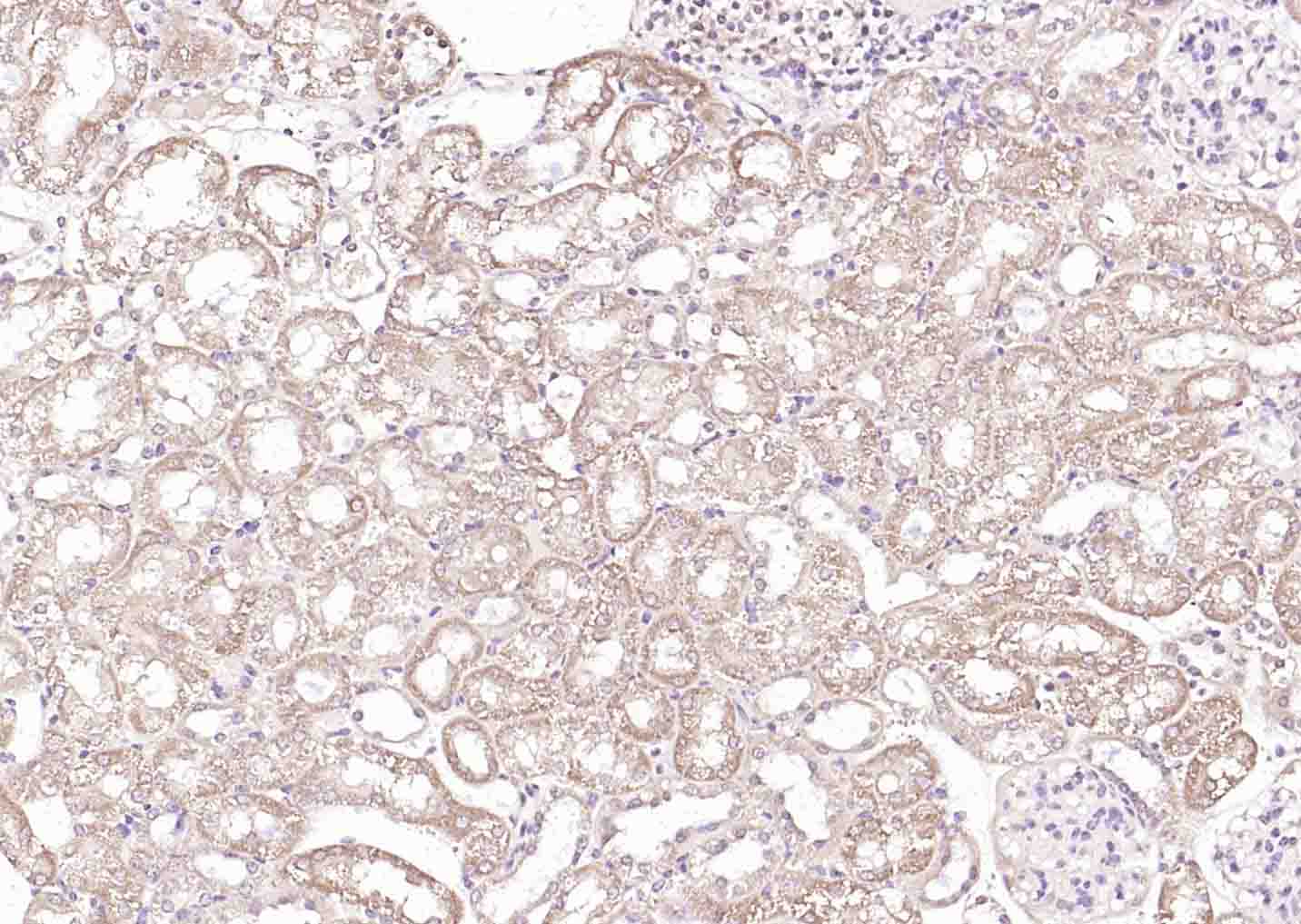 Paraformaldehyde-fixed, paraffin embedded (mouse kidney); Antigen retrieval by boiling in sodium citrate buffer (pH6.0) for 15min; Block endogenous peroxidase by 3% hydrogen peroxide for 20 minutes; Blocking buffer (normal goat serum) at 37°C for 30min; Incubation with (phospho-PRKD1) Polyclonal Antibody, Unconjugated (bs-5561R) at 1:200 overnight at 4°C, followed by operating according to SP Kit(Rabbit) (sp-0023) instructionsand DAB staining.