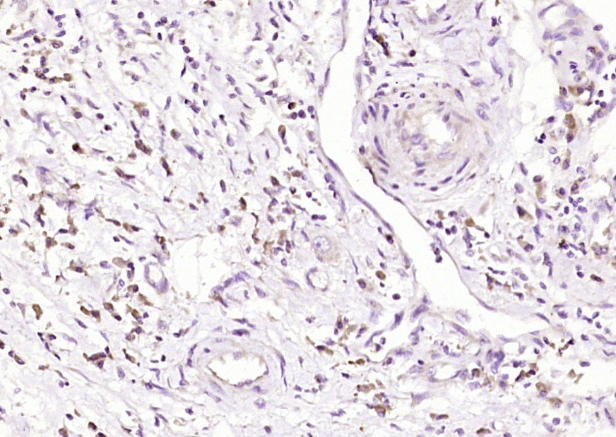 Paraformaldehyde-fixed, paraffin embedded (human colon carcinoma); Antigen retrieval by boiling in sodium citrate buffer (pH6.0) for 15min; Block endogenous peroxidase by 3% hydrogen peroxide for 20 minutes; Blocking buffer (normal goat serum) at 37°C for 30min; Antibody incubation with (RelB) Polyclonal Antibody, Unconjugated (bs-4185R) at 1:200 overnight at 4°C, followed by operating according to SP Kit(Rabbit) (sp-0023) instructionsand DAB staining.