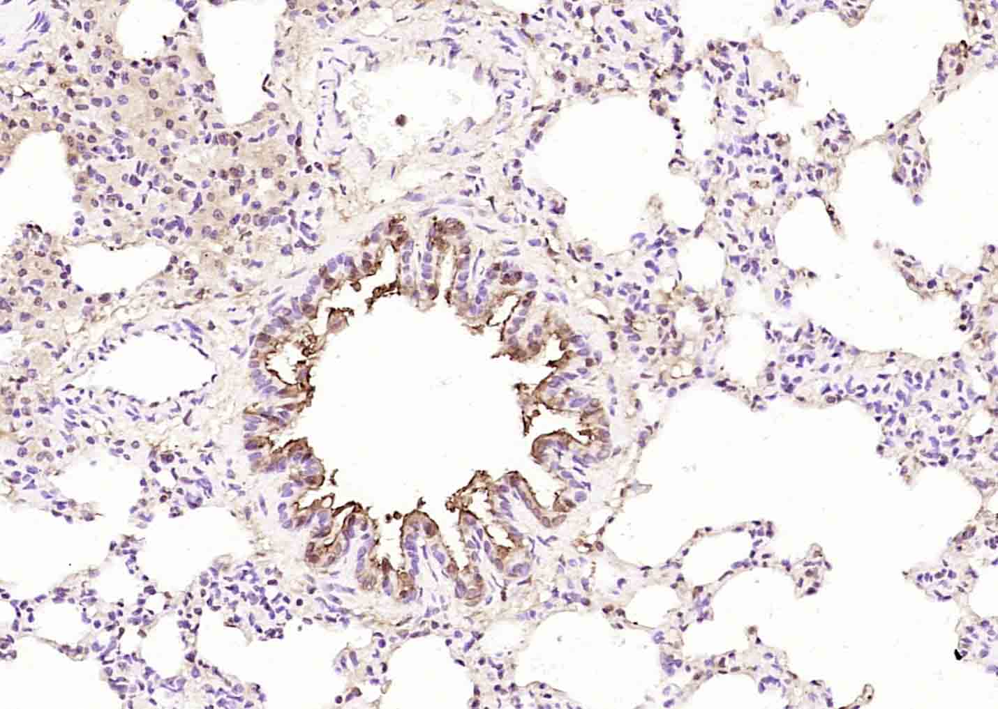 Paraformaldehyde-fixed, paraffin embedded (rat lung); Antigen retrieval by boiling in sodium citrate buffer (pH6.0) for 15min; Block endogenous peroxidase by 3% hydrogen peroxide for 20 minutes; Blocking buffer (normal goat serum) at 37°C for 30min; Antibody incubation with (Selenium Binding Protein 1) Polyclonal Antibody, Unconjugated (bs-4200R) at 1:200 overnight at 4°C, followed by operating according to SP Kit(Rabbit) (sp-0023) instructionsand DAB staining.
