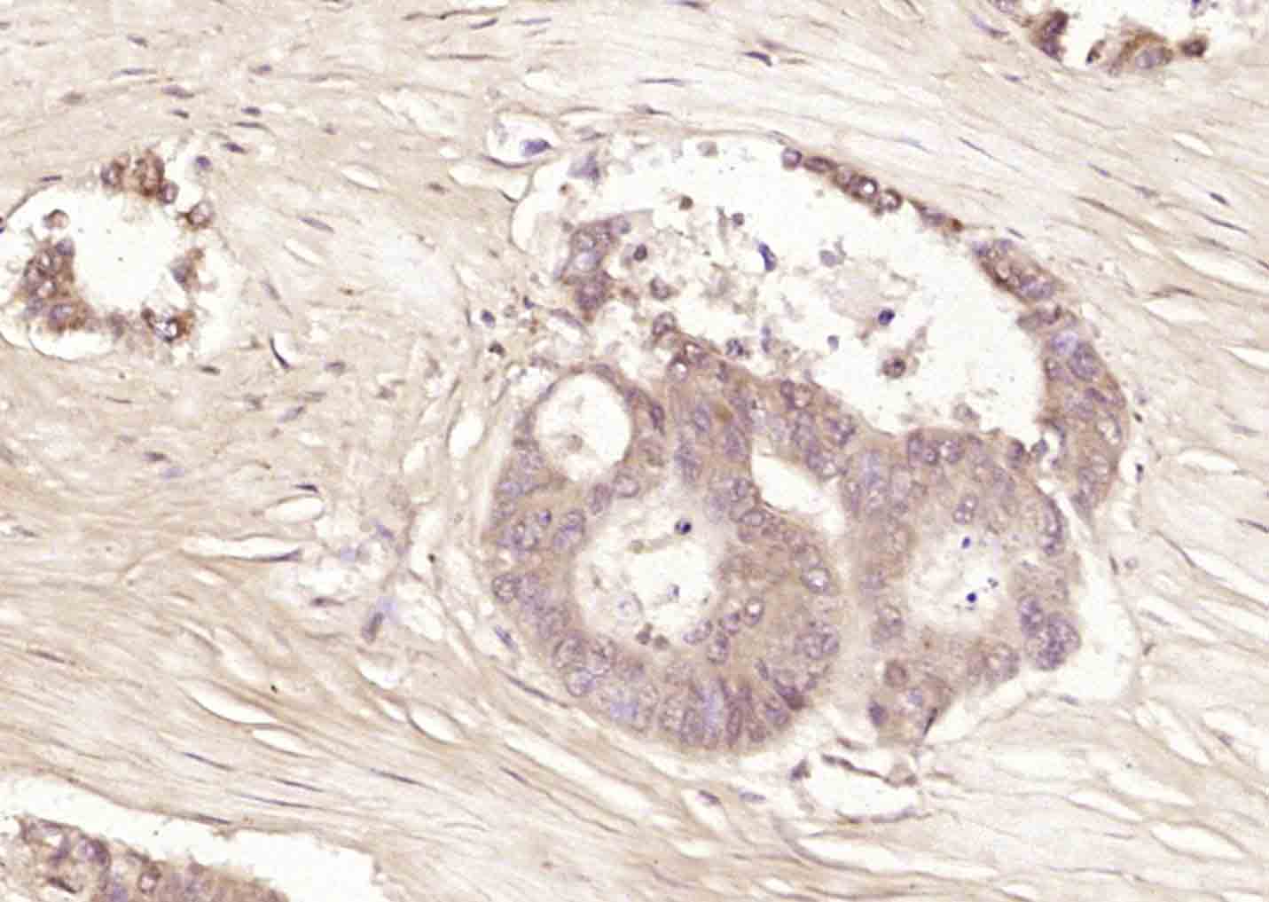 Paraformaldehyde-fixed, paraffin embedded (mouse colon); Antigen retrieval by boiling in sodium citrate buffer (pH6.0) for 15min; Block endogenous peroxidase by 3% hydrogen peroxide for 20 minutes; Blocking buffer (normal goat serum) at 37°C for 30min; Antibody incubation with (GDNF) Polyclonal Antibody, Unconjugated (bs-1024R) at 1:200 overnight at 4°C, followed by operating according to SP Kit(Rabbit) (sp-0023) instructionsand DAB staining.