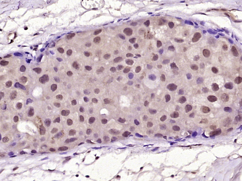 Paraformaldehyde-fixed, paraffin embedded (Human breast carcinoma); Antigen retrieval by boiling in sodium citrate buffer (pH6.0) for 15min; Block endogenous peroxidase by 3% hydrogen peroxide for 20 minutes; Blocking buffer (normal goat serum) at 37°C for 30min; Antibody incubation with (HER2 receptor) Monoclonal Antibody, Unconjugated (ascites of bsm-2156M 1A4) at 1:400 overnight at 4°C, followed by a conjugated secondary (sp-0023) for 20 minutes and DAB staining.