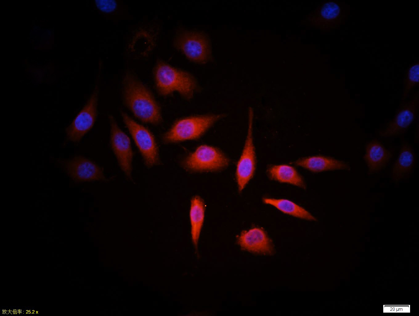 Tissue/cell:MCF7 cell; 4% Paraformaldehyde-fixed; Triton X-100 at room temperature for 20 min; Blocking buffer (normal goat serum, C-0005) at 37°C for 20 min; Antibody incubation with (HER2 receptor) monoclonal Antibody, Unconjugated (bsm-2156M) 1:100, 90 minutes at 37°C; followed by a CY3 conjugated Goat Anti-Mouse IgG antibody at 37°C for 90 minutes, DAPI (blue, C02-04002) was used to stain the cell nuclei.