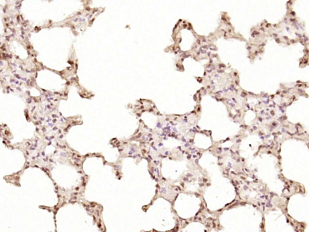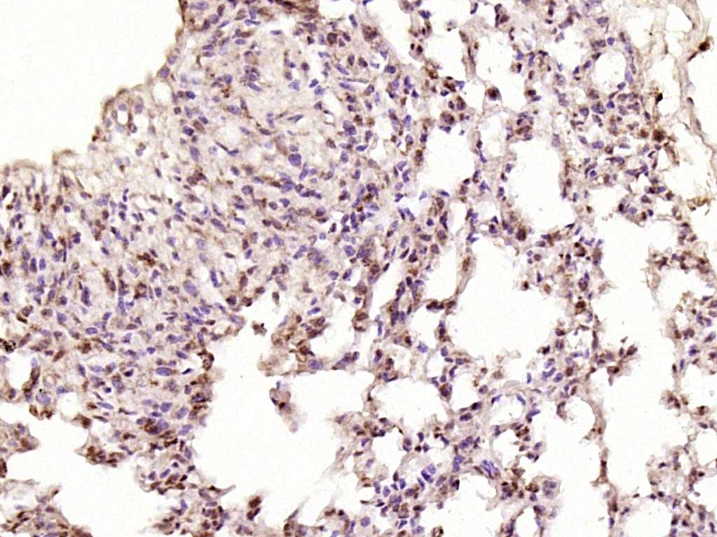 Paraformaldehyde-fixed, paraffin embedded (mouse lung); Antigen retrieval by boiling in sodium citrate buffer (pH6.0) for 15min; Block endogenous peroxidase by 3% hydrogen peroxide for 20 minutes; Blocking buffer (normal goat serum) at 37°C for 30min; Antibody incubation with (ZNF693) Polyclonal Antibody, Unconjugated (bs-5716R) at 1:200 overnight at 4°C, followed by operating according to SP Kit(Rabbit) (sp-0023) instructionsand DAB staining.