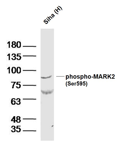 Sample: Siha Cell (Human) Lysate at 30 ug Primary: Anti-phospho-MARK2(Ser595) (bs-5742R)at 1/300 dilution Secondary: IRDye800CW Goat Anti-Rabbit IgG at 1/20000 dilution Predicted band size: 82-90kD Observed band size: 90kD
