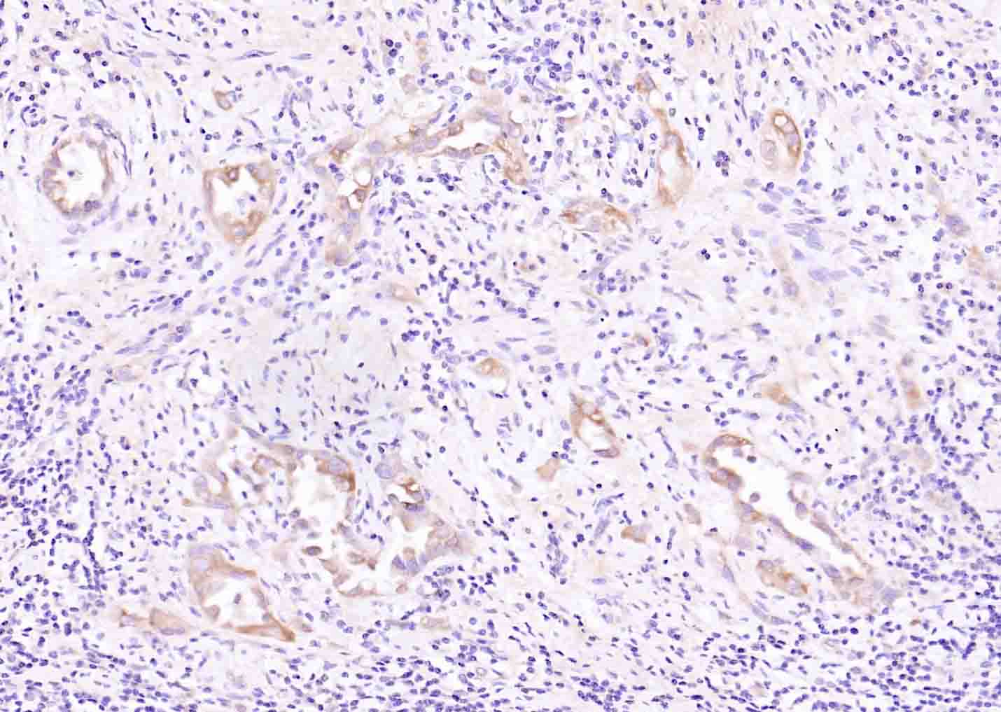 Paraformaldehyde-fixed, paraffin embedded (human cervical carcinoma); Antigen retrieval by boiling in sodium citrate buffer (pH6.0) for 15min; Block endogenous peroxidase by 3% hydrogen peroxide for 20 minutes; Blocking buffer (normal goat serum) at 37°C for 30min; Incubation with (RIPK1 ) Polyclonal Antibody, Unconjugated (bs-5805R) at 1:200 overnight at 4°C, followed by operating according to SP Kit(Rabbit) (sp-0023) instructionsand DAB staining.