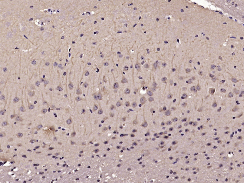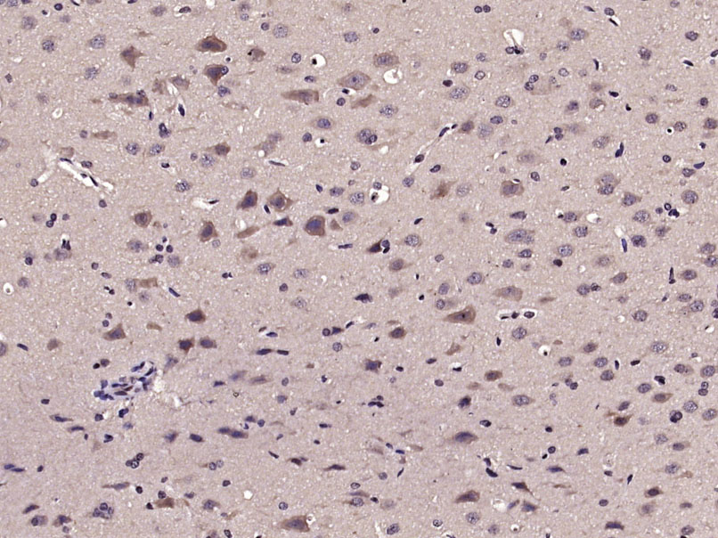 Paraformaldehyde-fixed, paraffin embedded (Mouse brain); Antigen retrieval by microwave in sodium citrate buffer (pH6.0) ; Block endogenous peroxidase by 3% hydrogen peroxide for 30 minutes; Blocking buffer (3% BSA) at RT for 30min; Antibody incubation with (RIPK-1) Polyclonal Antibody, Unconjugated (bs-5805R) at 1:400 overnight at 4℃, followed by conjugation to the secondary antibody (labeled with HRP)and DAB staining.