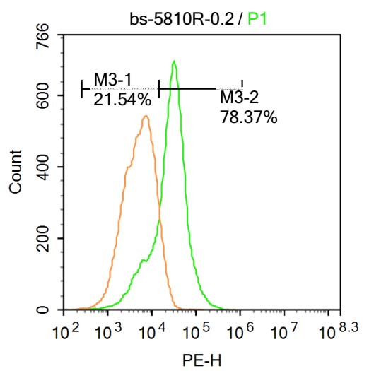 U-937 cells were fixed with 4% PFA for 10min at room temperature,permeabilized with 90% ice-cold methanol for 20 min at room temperature,and incubated in 5% BSA blocking buffer for 30 min at room temperature. Cells were then stained with Lactoferrin Antibody(bs-5810R) at 1:500 dilution in blocking buffer and incubated for 30 min at room temperature, washed twice with 2%BSA in PBS, followed by secondary antibody incubation for 40 min at room temperature. Acquisitions of 20,000 events were performed.Cells stained with primary antibody (green), and isotype control (orange).