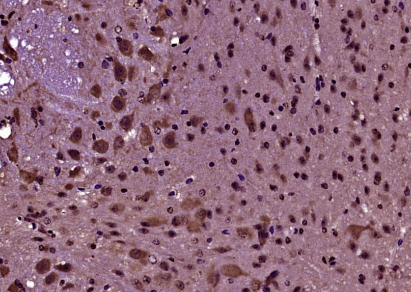 Paraformaldehyde-fixed, paraffin embedded (Mouse brain); Antigen retrieval by boiling in sodium citrate buffer (pH6.0) for 15min; Block endogenous peroxidase by 3% hydrogen peroxide for 20 minutes; Blocking buffer (normal goat serum) at 37°C for 30min; Antibody incubation with (PRODH) Polyclonal Antibody, Unconjugated (bs-5813R) at 1:400 overnight at 4°C, followed by operating according to SP Kit(Rabbit) (sp-0023) instructionsand DAB staining.