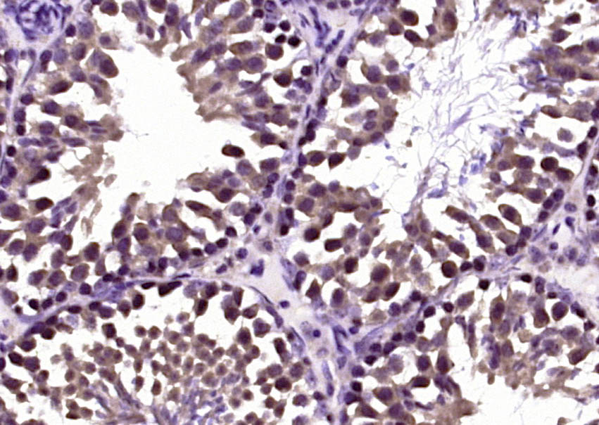 Paraformaldehyde-fixed, paraffin embedded (Mouse testis); Antigen retrieval by boiling in sodium citrate buffer (pH6.0) for 15min; Block endogenous peroxidase by 3% hydrogen peroxide for 20 minutes; Blocking buffer (normal goat serum) at 37°C for 30min; Antibody incubation with (Klotho) Polyclonal Antibody, Unconjugated (bs-2925R) at 1:400 overnight at 4°C, followed by operating according to SP Kit(Rabbit) (sp-0023) instructionsand DAB staining.