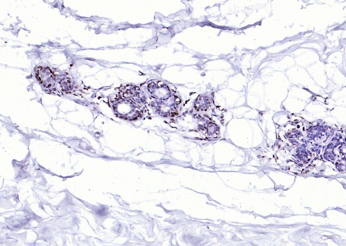 Paraformaldehyde-fixed, paraffin embedded (human breast); Antigen retrieval by boiling in sodium citrate buffer (pH6.0) for 15min; Block endogenous peroxidase by 3% hydrogen peroxide for 20 minutes; Blocking buffer (normal goat serum) at 37°C for 30min; Antibody incubation with (MYB) Polyclonal Antibody, Unconjugated (bs-5978R) at 1:200 overnight at 4°C, followed by operating according to SP Kit(Rabbit) (sp-0023) instructionsand DAB staining.