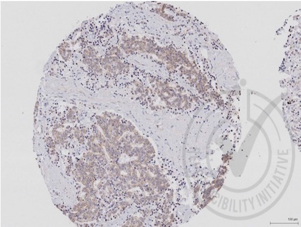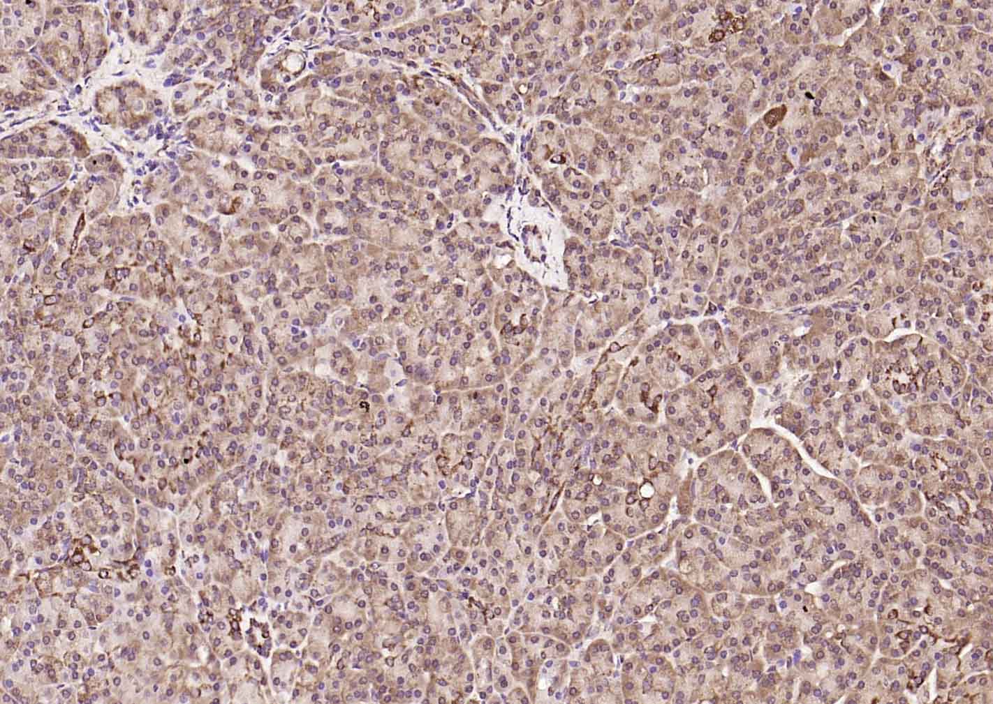 Paraformaldehyde-fixed, paraffin embedded (human pancreas); Antigen retrieval by boiling in sodium citrate buffer (pH6.0) for 15min; Block endogenous peroxidase by 3% hydrogen peroxide for 20 minutes; Blocking buffer (normal goat serum) at 37°C for 30min; Incubation with (Frizzled 5) Polyclonal Antibody, Unconjugated (bs-2930R) at 1:200 overnight at 4°C, followed by operating according to SP Kit(Rabbit) (sp-0023) instructionsand DAB staining.