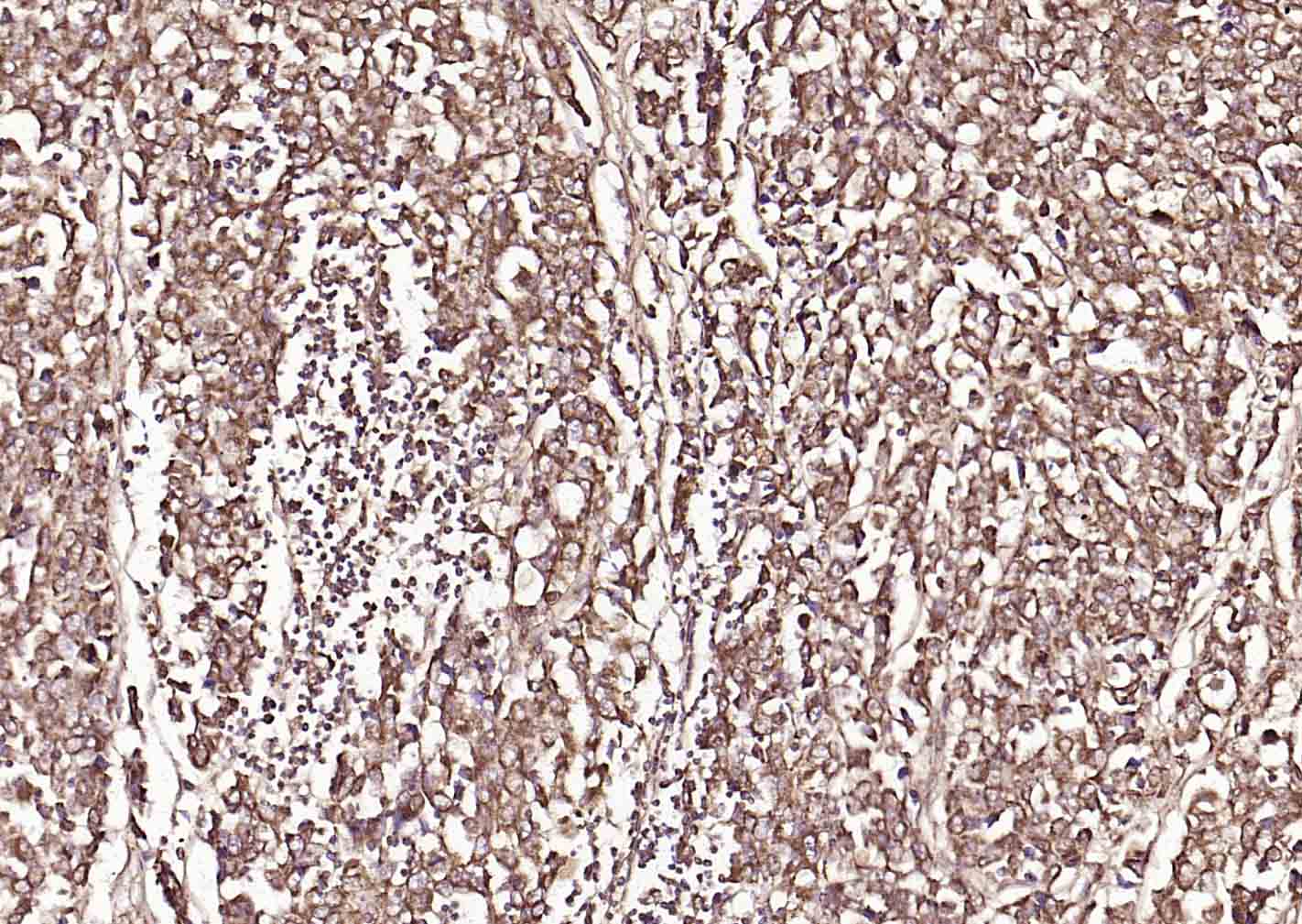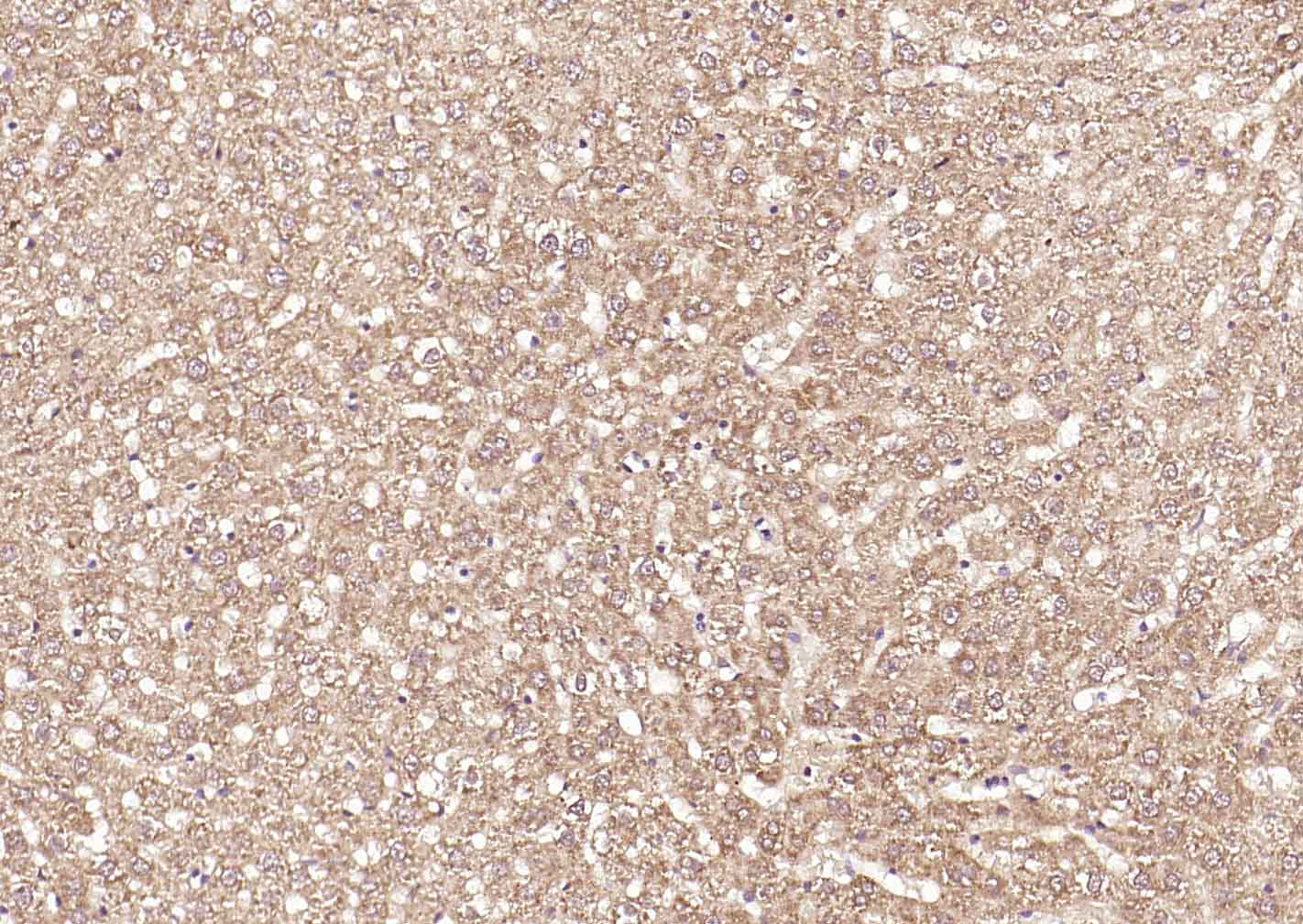 Paraformaldehyde-fixed, paraffin embedded (human liver carcinoma); Antigen retrieval by boiling in sodium citrate buffer (pH6.0) for 15min; Block endogenous peroxidase by 3% hydrogen peroxide for 20 minutes; Blocking buffer (normal goat serum) at 37°C for 30min; Incubation with (Frizzled 5) Polyclonal Antibody, Unconjugated (bs-2930R) at 1:200 overnight at 4°C, followed by operating according to SP Kit(Rabbit) (sp-0023) instructionsand DAB staining.