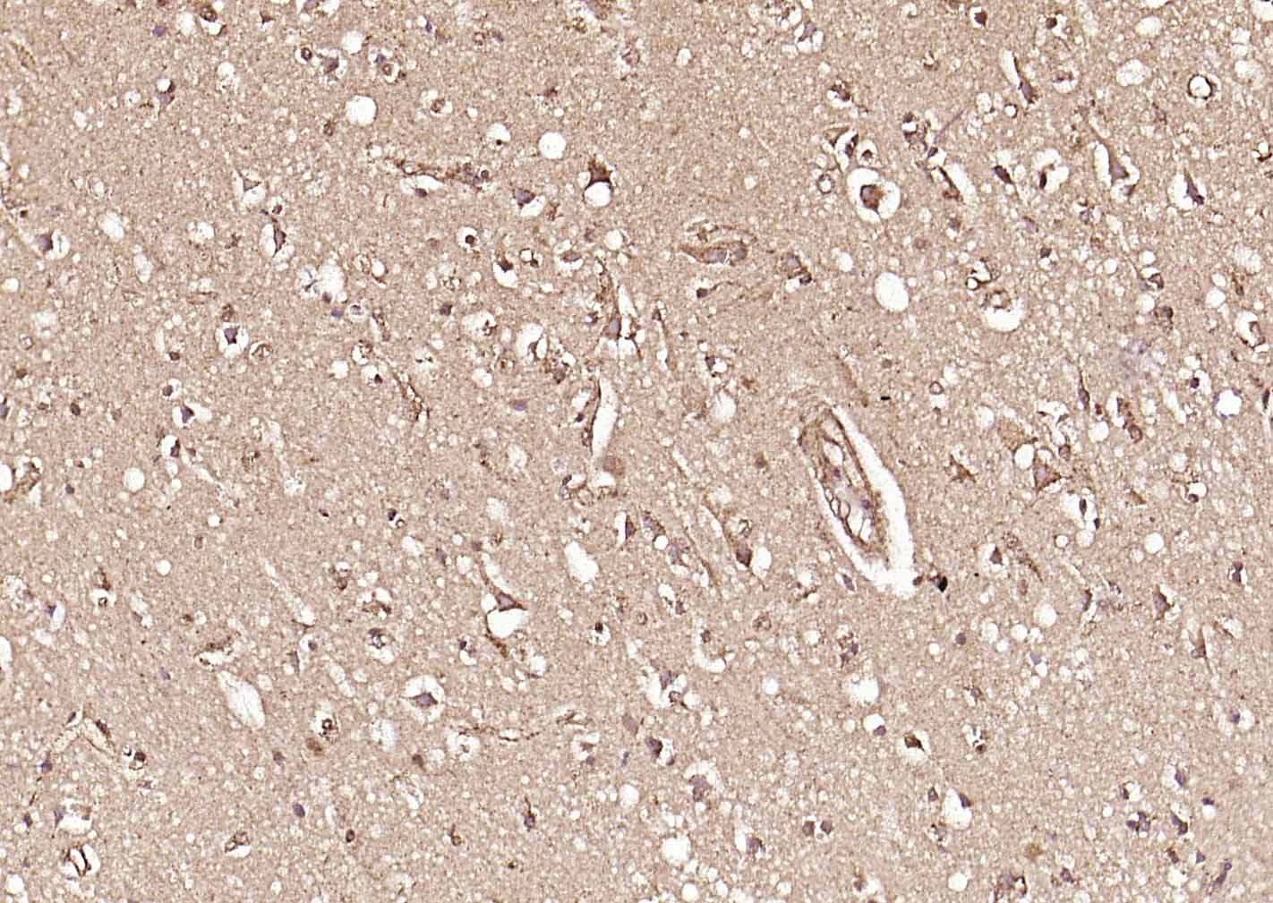 Paraformaldehyde-fixed, paraffin embedded (human brain); Antigen retrieval by boiling in sodium citrate buffer (pH6.0) for 15min; Block endogenous peroxidase by 3% hydrogen peroxide for 20 minutes; Blocking buffer (normal goat serum) at 37°C for 30min; Incubation with (Frizzled 5) Polyclonal Antibody, Unconjugated (bs-2930R) at 1:200 overnight at 4°C, followed by operating according to SP Kit(Rabbit) (sp-0023) instructionsand DAB staining.