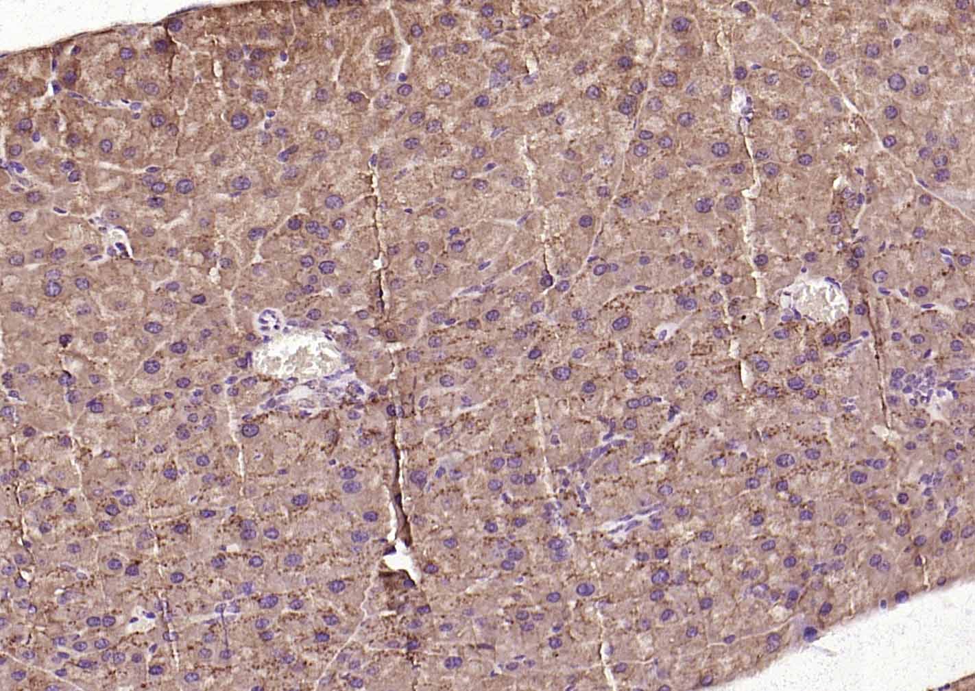 Paraformaldehyde-fixed, paraffin embedded (mouse liver); Antigen retrieval by boiling in sodium citrate buffer (pH6.0) for 15min; Block endogenous peroxidase by 3% hydrogen peroxide for 20 minutes; Blocking buffer (normal goat serum) at 37°C for 30min; Incubation with (Frizzled 5) Polyclonal Antibody, Unconjugated (bs-2930R) at 1:200 overnight at 4°C, followed by operating according to SP Kit(Rabbit) (sp-0023) instructionsand DAB staining.