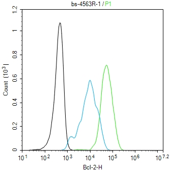 The Hela (H) cells were fixed with 4% PFA (10 min at r.t.) and then permeabilized with 90% ice-cold methanol for 20 min at -20℃,the cells then were incubated in 5%BSA to block non-specific protein-protein interactions (30 min at r.t.).Primary Antibody (green):Rabbit Anti-Bcl-2 antibody (bs-4563R): 1 μg/10^6 cells; Secondary Antibody (white blue): Goat anti-Rabbit IgG-FITC (bs-40295G-FITC): 1 μg/test. Blank control (black): PBS. Acquisition of 20,000 events was performed.