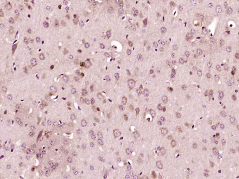 Paraformaldehyde-fixed, paraffin embedded (Mouse brain); Antigen retrieval by boiling in sodium citrate buffer (pH6.0) for 15min; Block endogenous peroxidase by 3% hydrogen peroxide for 20 minutes; Blocking buffer (normal goat serum) at 37°C for 30min; Antibody incubation with (Mitofusin 2) Polyclonal Antibody, Unconjugated (bs-2988R) at 1:400 overnight at 4°C, followed by operating according to SP Kit(Rabbit) (sp-0023) instructionsand DAB staining.
