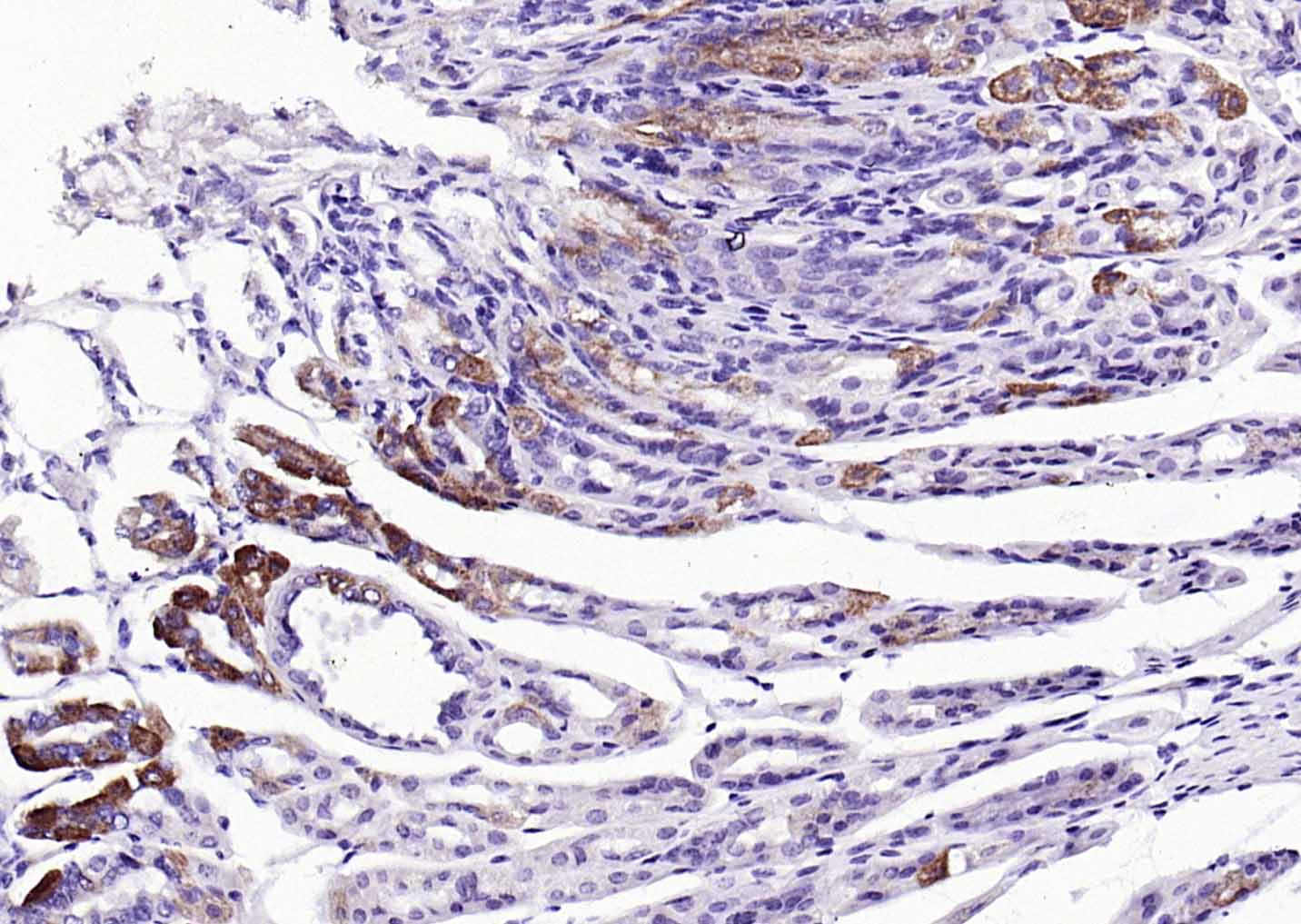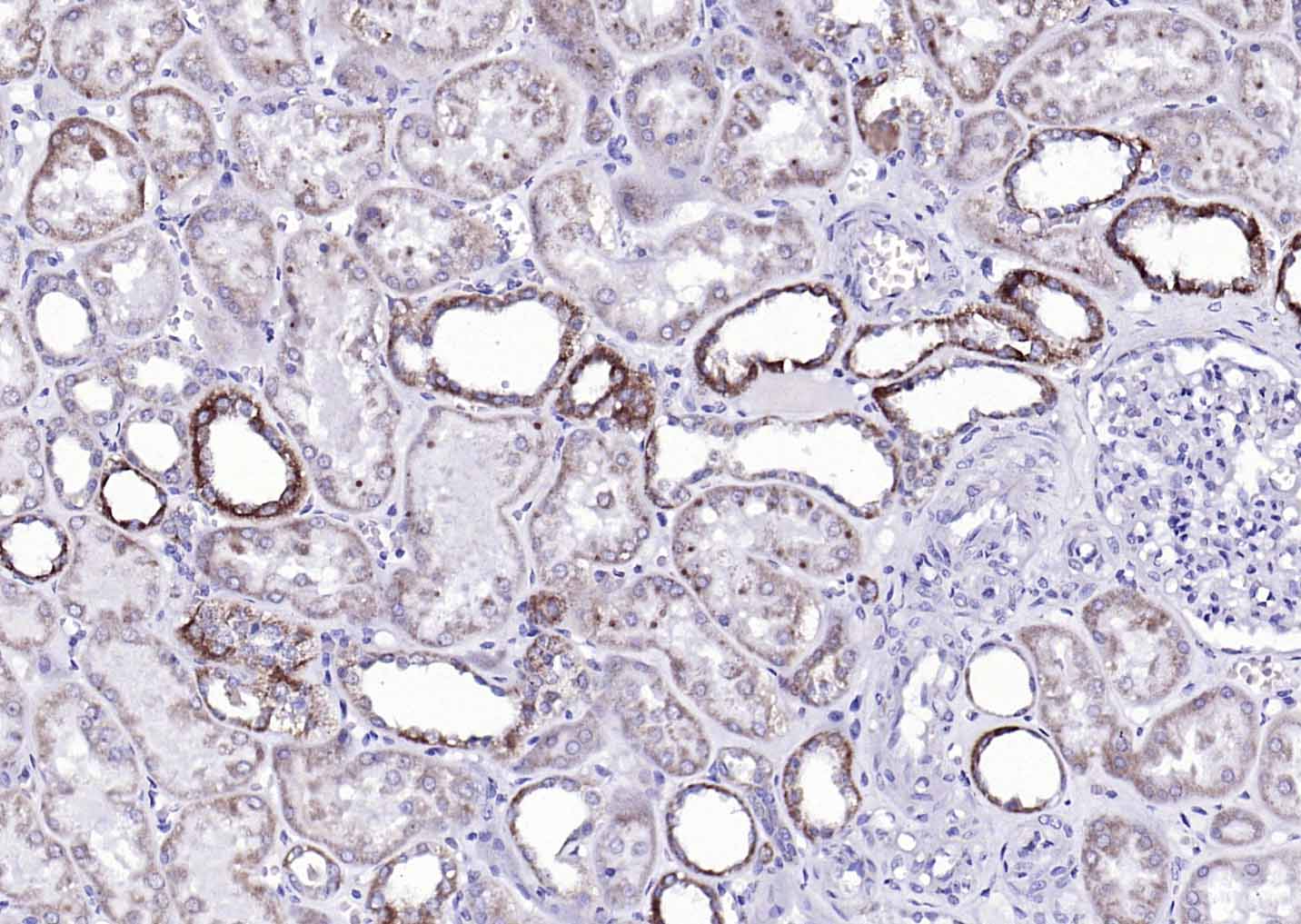 Paraformaldehyde-fixed, paraffin embedded (human kidney); Antigen retrieval by boiling in sodium citrate buffer (pH6.0) for 15min; Block endogenous peroxidase by 3% hydrogen peroxide for 20 minutes; Blocking buffer (normal goat serum) at 37°C for 30min; Antibody incubation with (Sclerostin) Polyclonal Antibody, Unconjugated (bs-6194R) at 1:200 overnight at 4°C, followed by operating according to SP Kit(Rabbit) (sp-0023) instructionsand DAB staining.