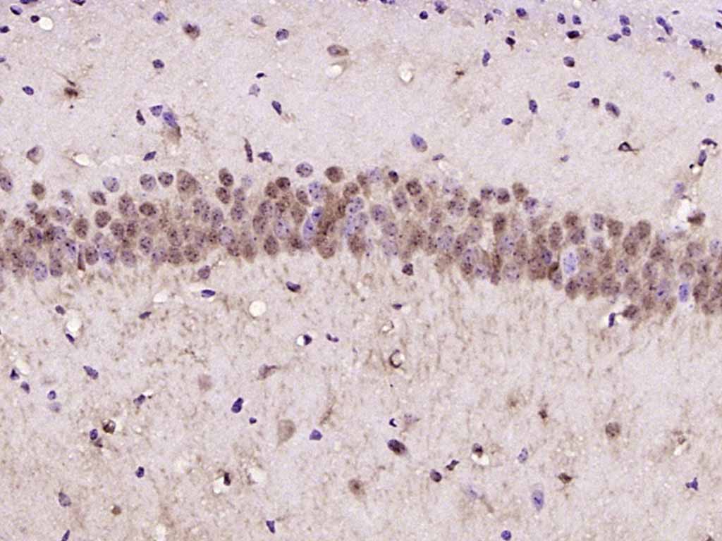 Paraformaldehyde-fixed, paraffin embedded (mouse brain); Antigen retrieval by boiling in sodium citrate buffer (pH6.0) for 15min; Block endogenous peroxidase by 3% hydrogen peroxide for 20 minutes; Blocking buffer (normal goat serum) at 37°C for 30min; Antibody incubation with (ROR beta) Polyclonal Antibody, Unconjugated (bs-6216R) at 1:200 overnight at 4°C, followed by operating according to SP Kit(Rabbit) (sp-0023) instructionsand DAB staining.