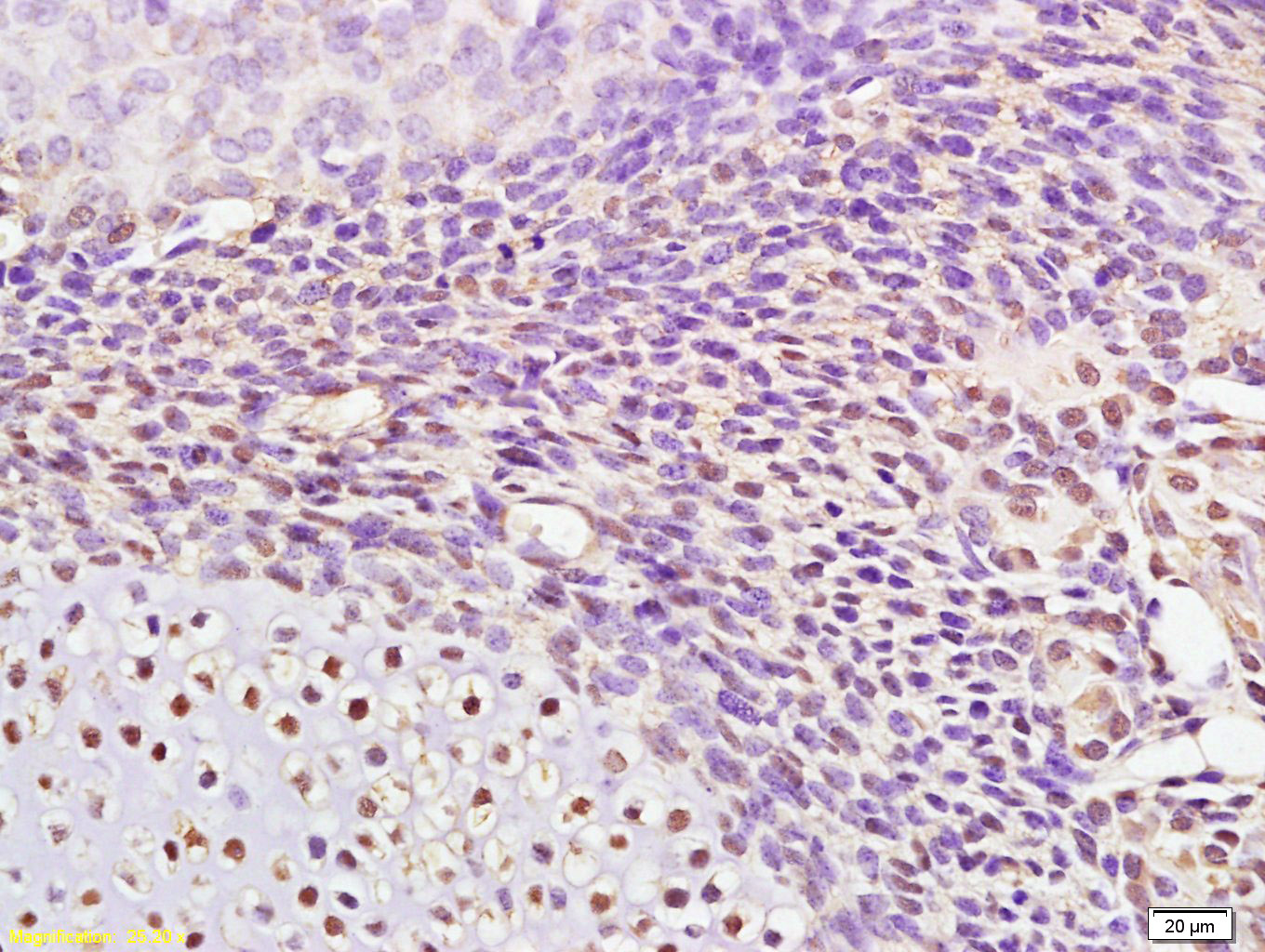 Antigen retrieval: citrate buffer ( 0.01M, pH 6.0 ), Boiling bathing for 15min; Block endogenous peroxidase by 3% Hydrogen peroxide for 30min; Blocking buffer (normal goat serum,C-0005) at 37℃ for 20 min;