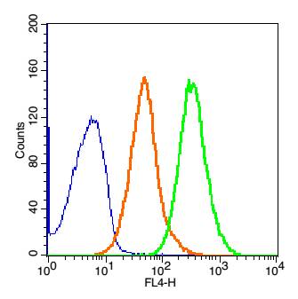 Blank control(blue): Hela Cells(fixed with 2% paraformaldehyde (10 min) and then permeabilized with ice-cold 90% methanol for 30 min on ice). Primary Antibody: Rabbit Anti-PRAME/AF647 Conjugated antibody (bs-7004R-AF647), Dilution: 0.2μg in 100 μL 1X PBS containing 0.5% BSA; Isotype Control Antibody: Rabbit IgG/AF647(orange) ,used under the same conditions.