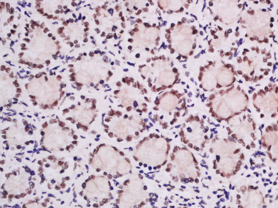 Paraformaldehyde-fixed, paraffin embedded (Mouse stomach); Antigen retrieval by boiling in sodium citrate buffer (pH6.0) for 15min; Block endogenous peroxidase by 3% hydrogen peroxide for 20 minutes; Blocking buffer (normal goat serum) at 37°C for 30min; Antibody incubation with (Ubiquitously expressed transcript) Polyclonal Antibody, Unconjugated (bs-6749R) at 1:200 overnight at 4°C, followed by operating according to SP Kit(Rabbit) (sp-0023) instructions and DAB staining.