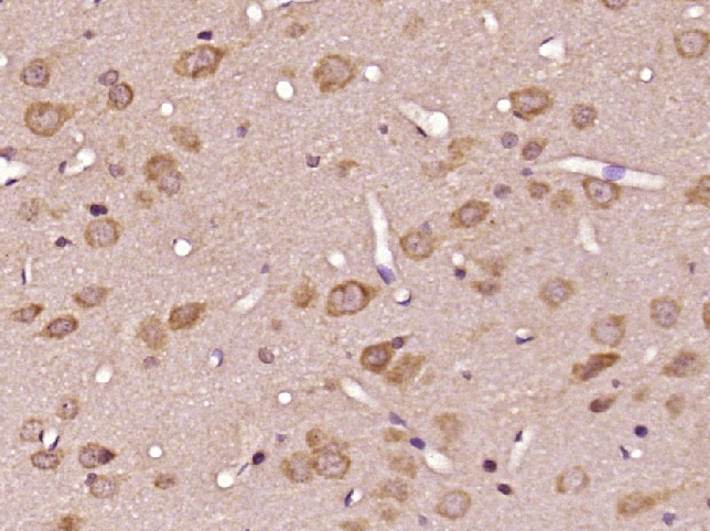Paraformaldehyde-fixed, paraffin embedded (Rat brain); Antigen retrieval by boiling in sodium citrate buffer (pH6.0) for 15min; Block endogenous peroxidase by 3% hydrogen peroxide for 20 minutes; Blocking buffer (normal goat serum) at 37°C for 30min; Antibody incubation with (IGF I) Polyclonal Antibody, Unconjugated (bs-4588R) at 1:400 overnight at 4°C, followed by operating according to SP Kit(Rabbit) (sp-0023) instructionsand DAB staining.