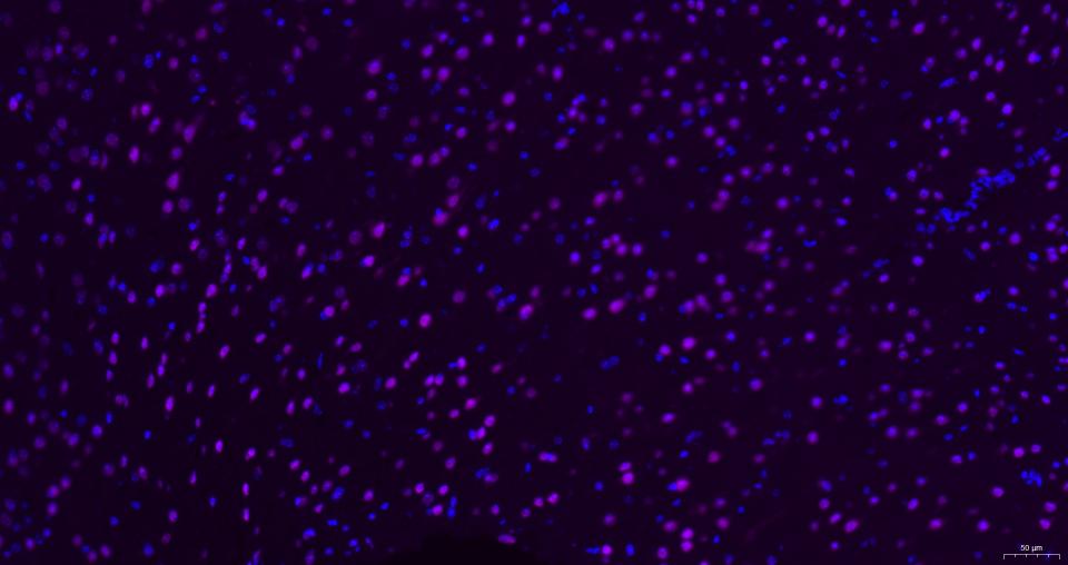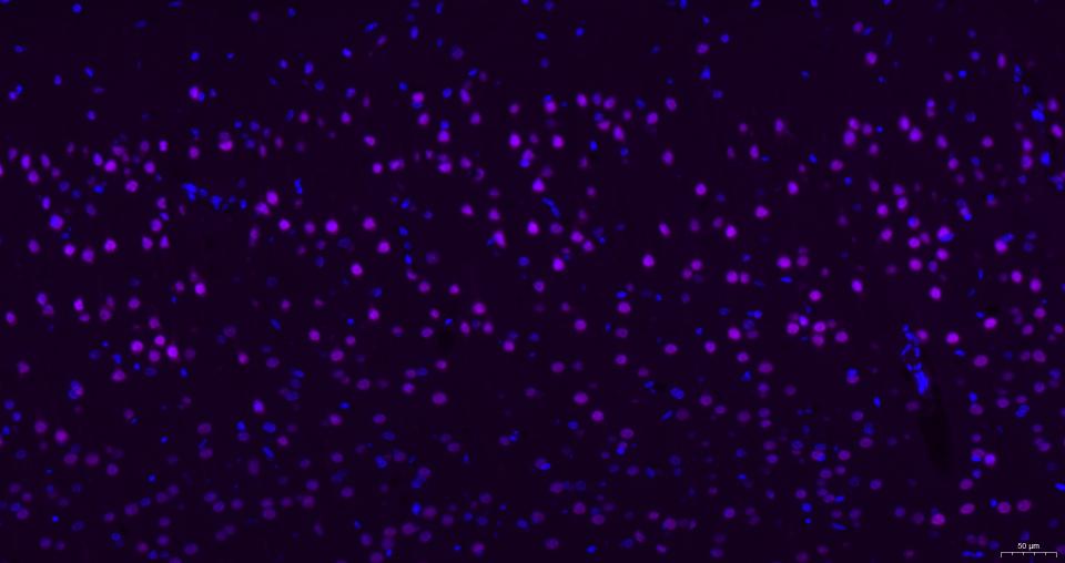 Paraformaldehyde-fixed, paraffin embedded Rat brain; Antigen retrieval by boiling in sodium citrate buffer (pH6.0) for 15 min; Antibody incubation with AKT1 Monoclonal Antibody, Unconjugated(bsm-52010R) at 1:200 overnight at 4°C, followed by a Cy5 conjugated Goat Anti-Rabbit IgG (bs-0295G-Cy5)antibody at 37°C for 90 minutes, DAPI (blue, C02-04002) was used to stain the cell nuclei.