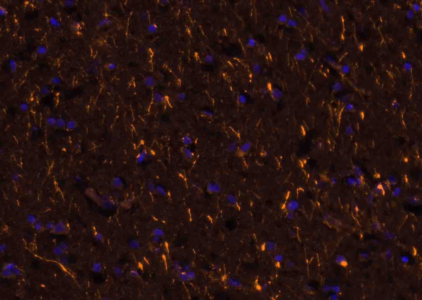 Paraformaldehyde-fixed, paraffin embedded (Rat brain); Antigen retrieval by boiling in sodium citrate buffer (pH6.0) for 15min; Block endogenous peroxidase by 3% hydrogen peroxide for 20 minutes; Blocking buffer (normal goat serum) at 37°C for 30min; Antibody incubation with (B MyB) Polyclonal Antibody, Unconjugated (bs-5960R) at 1:400 overnight at 4°C, followed by a conjugated Goat Anti-Rabbit IgG antibody (bs-0295G-BF555) for 90 minutes, and DAPI for nuclei staining.