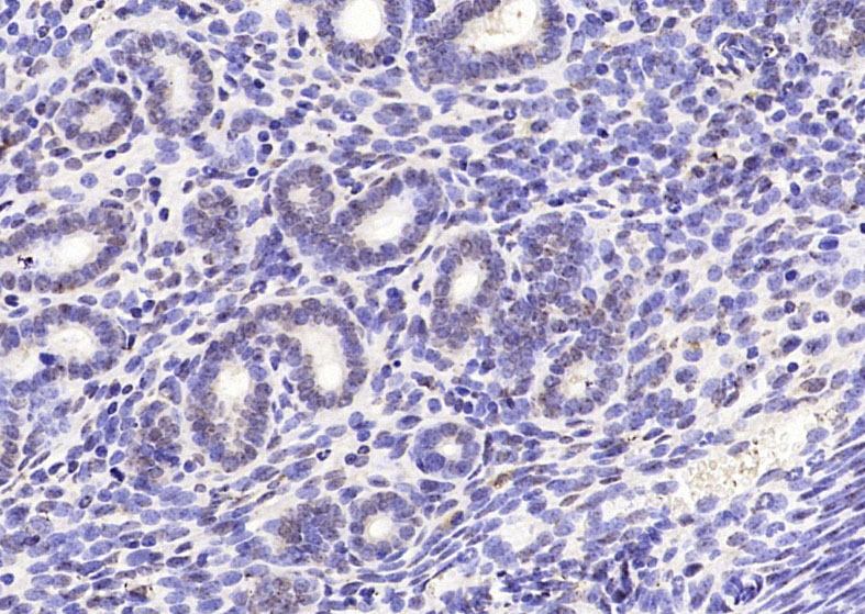 Paraformaldehyde-fixed, paraffin embedded (Mouse uterus); Antigen retrieval by boiling in sodium citrate buffer (pH6.0) for 15min; Block endogenous peroxidase by 3% hydrogen peroxide for 20 minutes; Blocking buffer (normal goat serum) at 37°C for 30min; Antibody incubation with (CENPT) Polyclonal Antibody, Unconjugated (bs-6901R) at 1:200 overnight at 4°C, followed by operating according to SP Kit(Rabbit) (sp-0023) instructionsand DAB staining.
