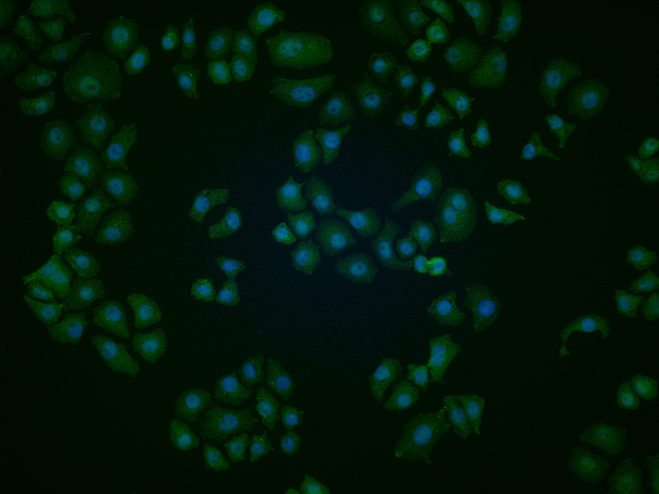 HepG2 cell; 4% Paraformaldehyde-fixed; Triton X-100 at room temperature for 20 min; Blocking buffer (normal goat serum, C-0005) at 37°C for 20 min; Antibody incubation with (NUF2) polyclonal Antibody, Unconjugated (bs-7714R) 1:50, 90 minutes at 37°C; followed by a conjugated Goat Anti-Rabbit IgG antibody at 37°C for 90 minutes, DAPI (blue, C02-04002) was used to stain the cell nuclei.