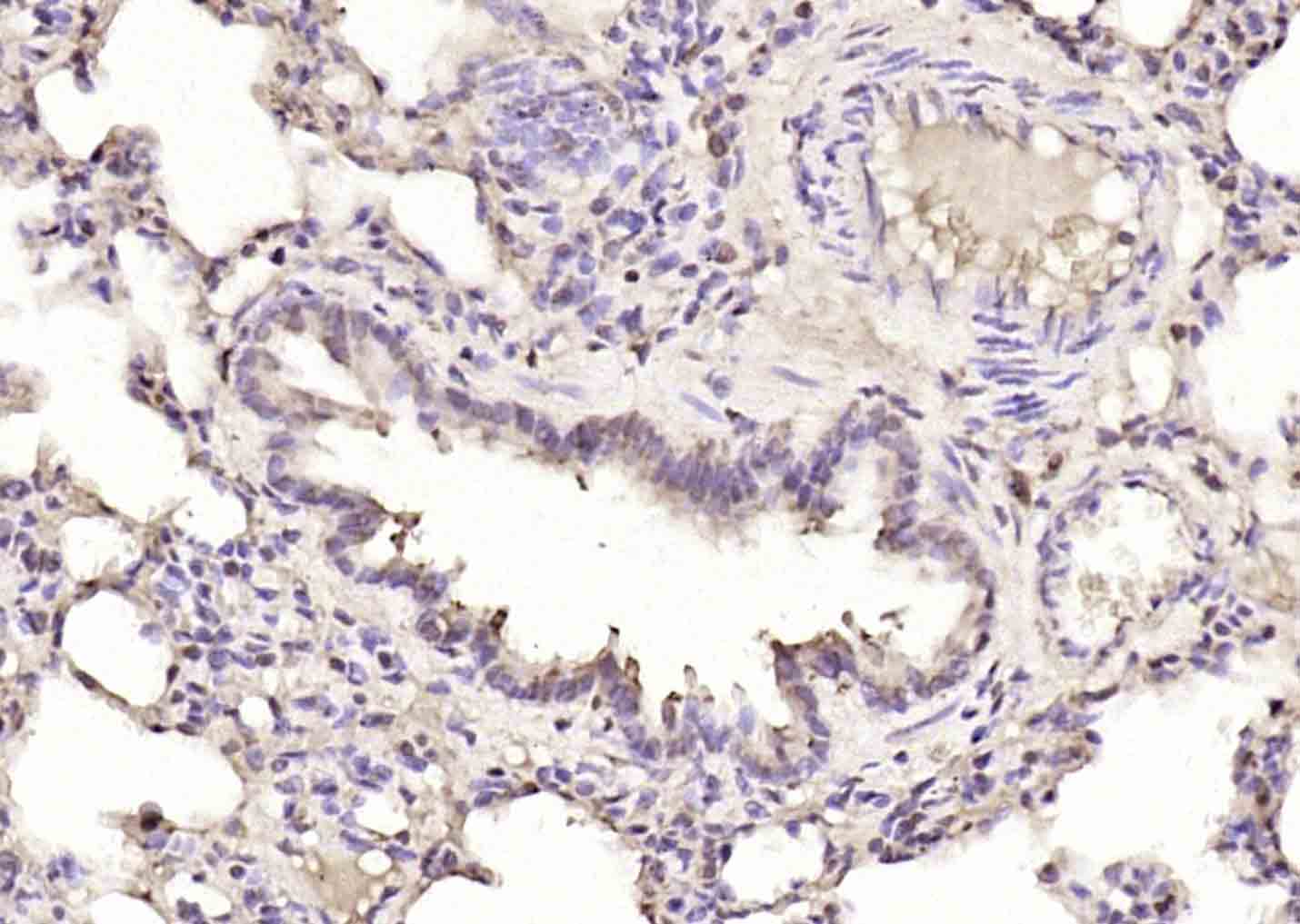 Paraformaldehyde-fixed, paraffin embedded (rat lung); Antigen retrieval by boiling in sodium citrate buffer (pH6.0) for 15min; Block endogenous peroxidase by 3% hydrogen peroxide for 20 minutes; Blocking buffer (normal goat serum) at 37°C for 30min; Antibody incubation with (SMC6) Polyclonal Antibody, Unconjugated (bs-7730R) at 1:200 overnight at 4°C, followed by operating according to SP Kit(Rabbit) (sp-0023) instructionsand DAB staining.