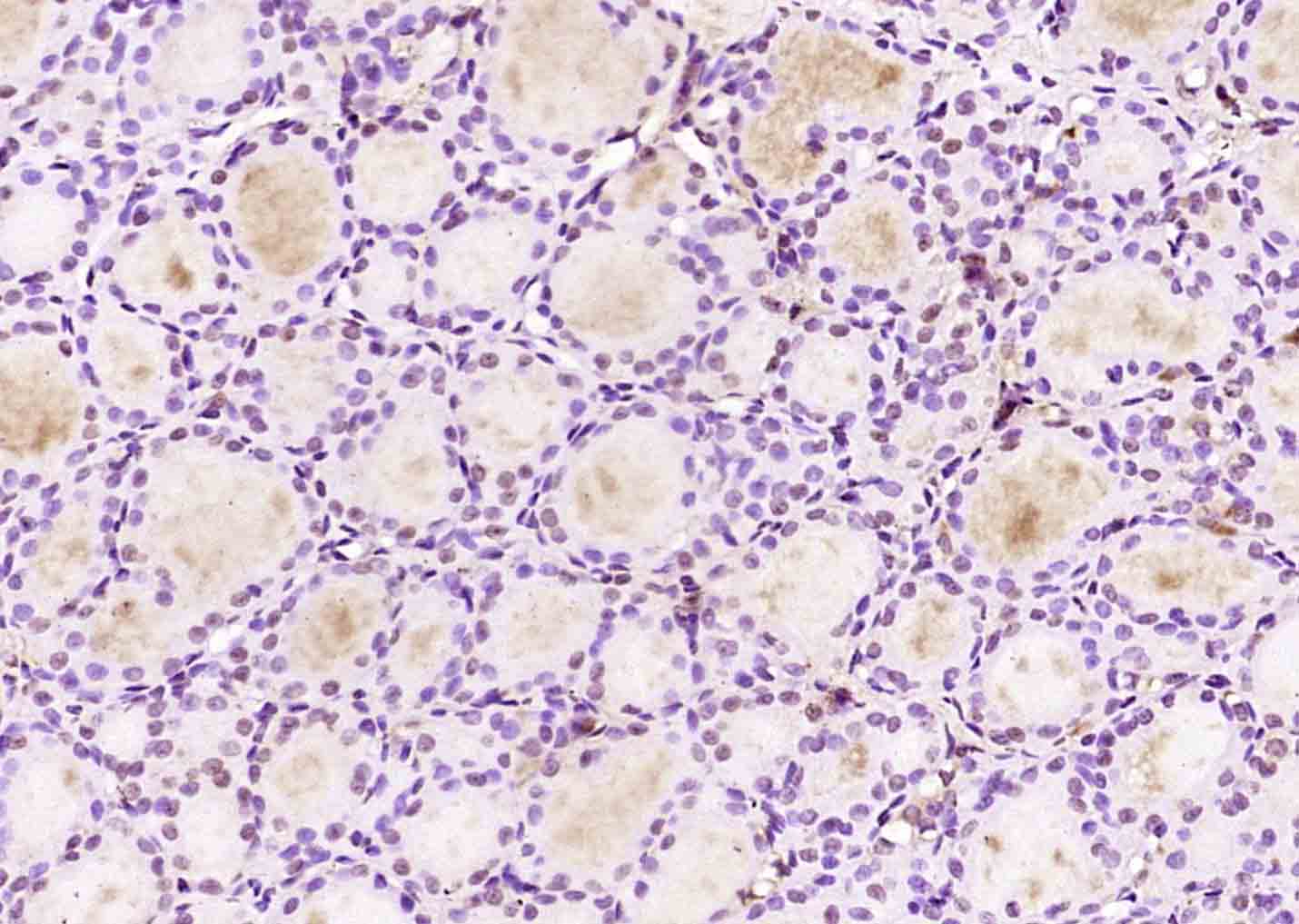 Paraformaldehyde-fixed, paraffin embedded (rat thyroid gland); Antigen retrieval by boiling in sodium citrate buffer (pH6.0) for 15min; Block endogenous peroxidase by 3% hydrogen peroxide for 20 minutes; Blocking buffer (normal goat serum) at 37°C for 30min; Antibody incubation with (NEK7) Polyclonal Antibody, Unconjugated (bs-7758R) at 1:200 overnight at 4°C, followed by operating according to SP Kit(Rabbit) (sp-0023) instructionsand DAB staining.