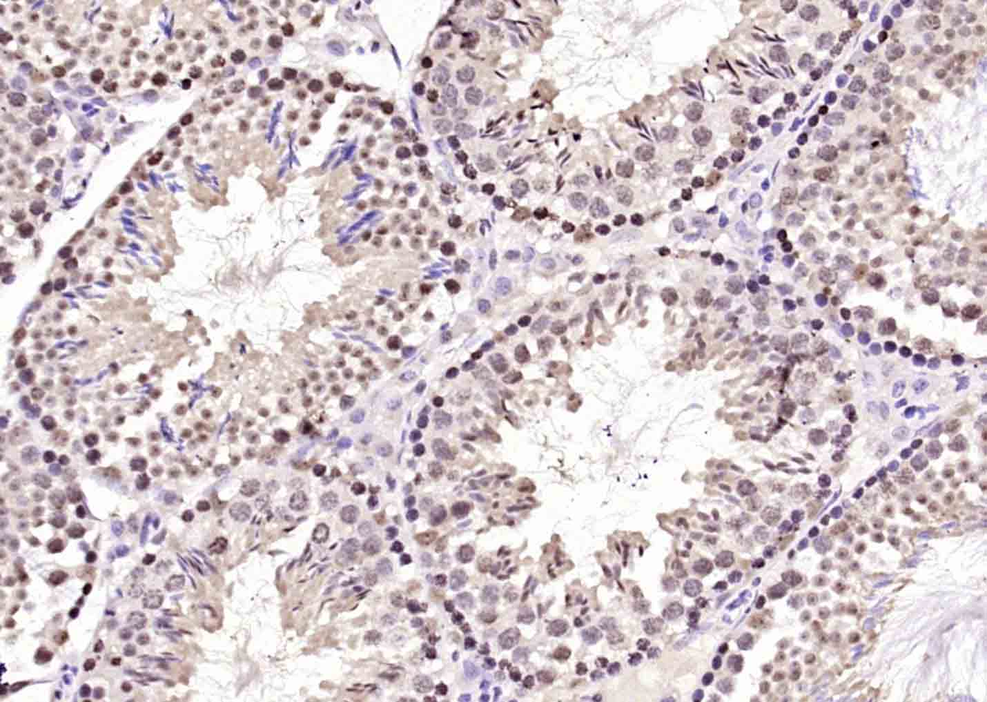 Paraformaldehyde-fixed, paraffin embedded (mouse testis); Antigen retrieval by boiling in sodium citrate buffer (pH6.0) for 15min; Block endogenous peroxidase by 3% hydrogen peroxide for 20 minutes; Blocking buffer (normal goat serum) at 37°C for 30min; Antibody incubation with (NEK7) Polyclonal Antibody, Unconjugated (bs-7758R) at 1:200 overnight at 4°C, followed by operating according to SP Kit(Rabbit) (sp-0023) instructionsand DAB staining.