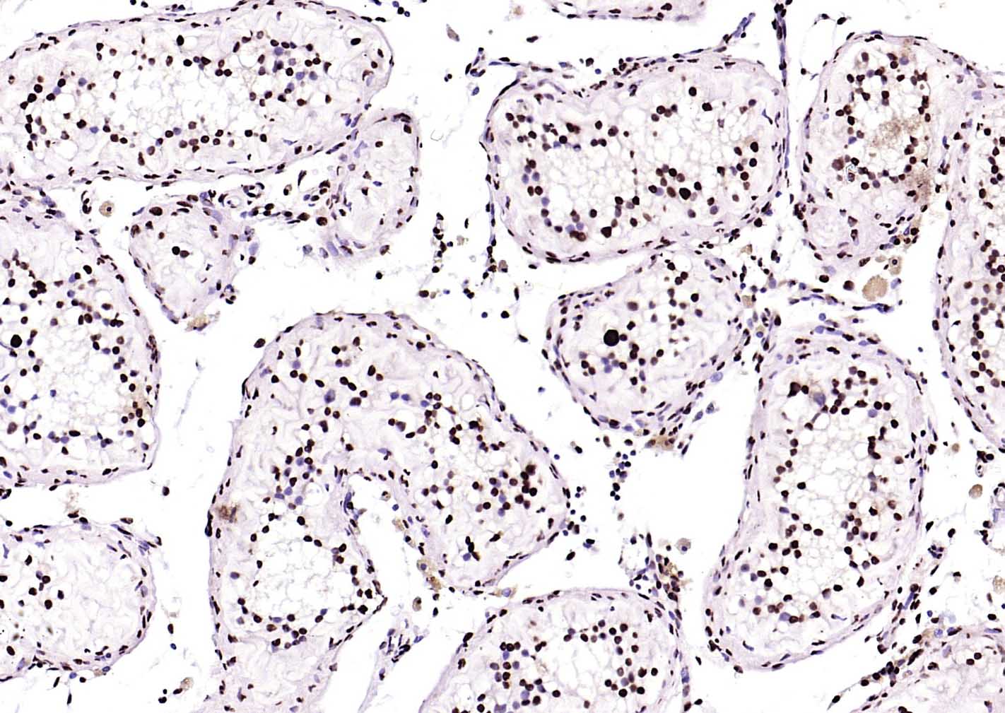 Paraformaldehyde-fixed, paraffin embedded (human testis); Antigen retrieval by boiling in sodium citrate buffer (pH6.0) for 15min; Block endogenous peroxidase by 3% hydrogen peroxide for 20 minutes; Blocking buffer (normal goat serum) at 37°C for 30min; Incubation with (BRD7) Polyclonal Antibody, Unconjugated (bs-7779R) at 1:200 overnight at 4°C, followed by operating according to SP Kit(Rabbit) (sp-0023) instructionsand DAB staining.