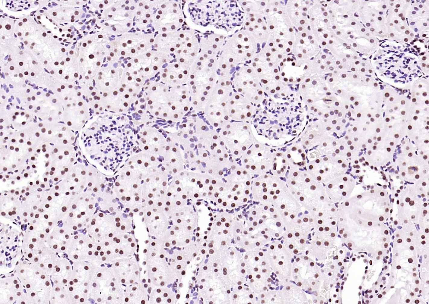 Paraformaldehyde-fixed, paraffin embedded (mouse kidney); Antigen retrieval by boiling in sodium citrate buffer (pH6.0) for 15min; Block endogenous peroxidase by 3% hydrogen peroxide for 20 minutes; Blocking buffer (normal goat serum) at 37°C for 30min; Incubation with (BRD7) Polyclonal Antibody, Unconjugated (bs-7779R) at 1:200 overnight at 4°C, followed by operating according to SP Kit(Rabbit) (sp-0023) instructionsand DAB staining.