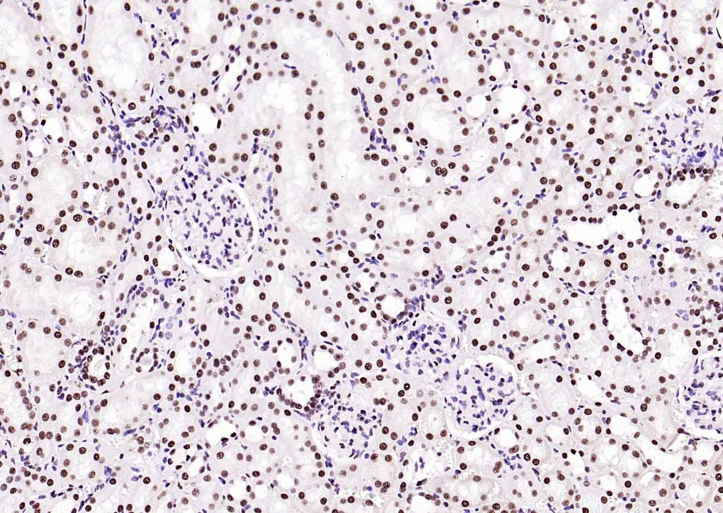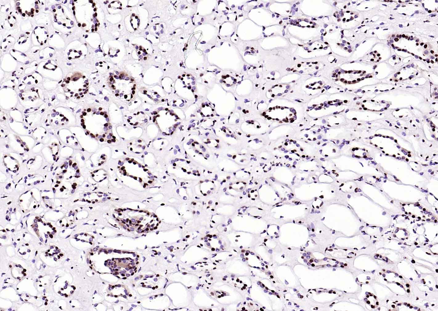 Paraformaldehyde-fixed, paraffin embedded (human kidney); Antigen retrieval by boiling in sodium citrate buffer (pH6.0) for 15min; Block endogenous peroxidase by 3% hydrogen peroxide for 20 minutes; Blocking buffer (normal goat serum) at 37°C for 30min; Incubation with (BRD7) Polyclonal Antibody, Unconjugated (bs-7779R) at 1:200 overnight at 4°C, followed by operating according to SP Kit(Rabbit) (sp-0023) instructionsand DAB staining.