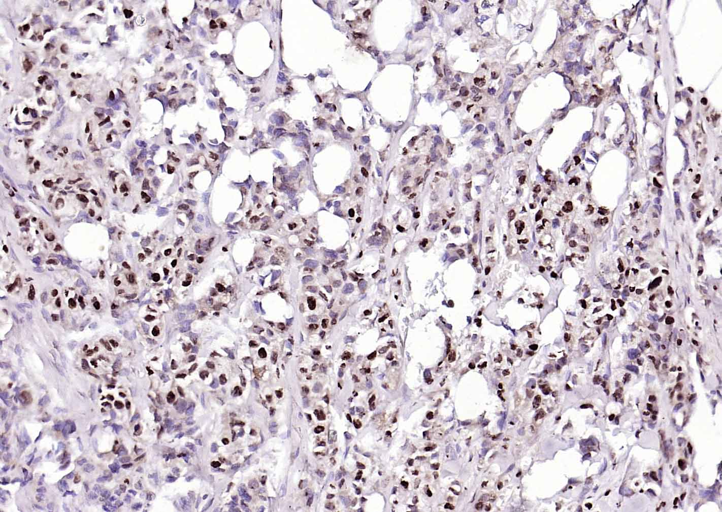 Paraformaldehyde-fixed, paraffin embedded (human breast carcinoma); Antigen retrieval by boiling in sodium citrate buffer (pH6.0) for 15min; Block endogenous peroxidase by 3% hydrogen peroxide for 20 minutes; Blocking buffer (normal goat serum) at 37°C for 30min; Incubation with (BRD7) Polyclonal Antibody, Unconjugated (bs-7779R) at 1:200 overnight at 4°C, followed by operating according to SP Kit(Rabbit) (sp-0023) instructionsand DAB staining.