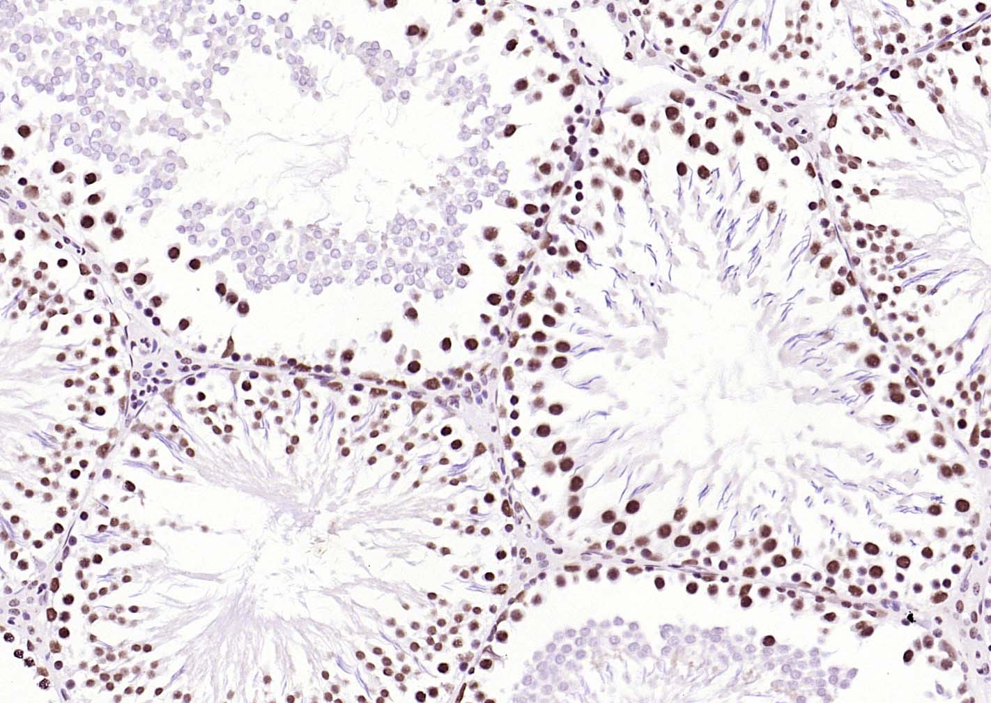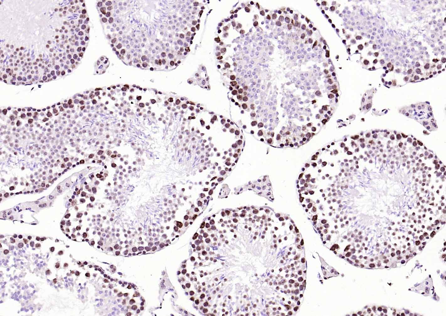 Paraformaldehyde-fixed, paraffin embedded (mouse testis); Antigen retrieval by boiling in sodium citrate buffer (pH6.0) for 15min; Block endogenous peroxidase by 3% hydrogen peroxide for 20 minutes; Blocking buffer (normal goat serum) at 37°C for 30min; Incubation with (BRD7) Polyclonal Antibody, Unconjugated (bs-7779R) at 1:200 overnight at 4°C, followed by operating according to SP Kit(Rabbit) (sp-0023) instructionsand DAB staining.