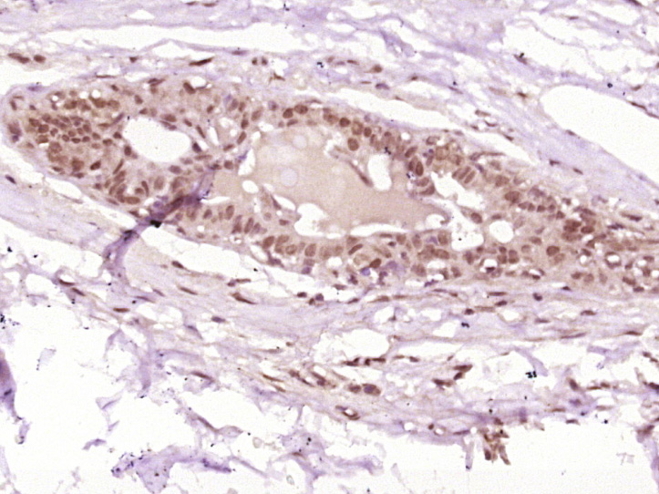 Paraformaldehyde-fixed, paraffin embedded (Human breast cancer); Antigen retrieval by boiling in sodium citrate buffer (pH6.0) for 15min; Block endogenous peroxidase by 3% hydrogen peroxide for 20 minutes; Blocking buffer (normal goat serum) at 37°C for 30min; Antibody incubation with (MND1) Polyclonal Antibody, Unconjugated (bs-7799R) at 1:400 overnight at 4°C, followed by operating according to SP Kit(Rabbit) (sp-0023) instructions and DAB staining.