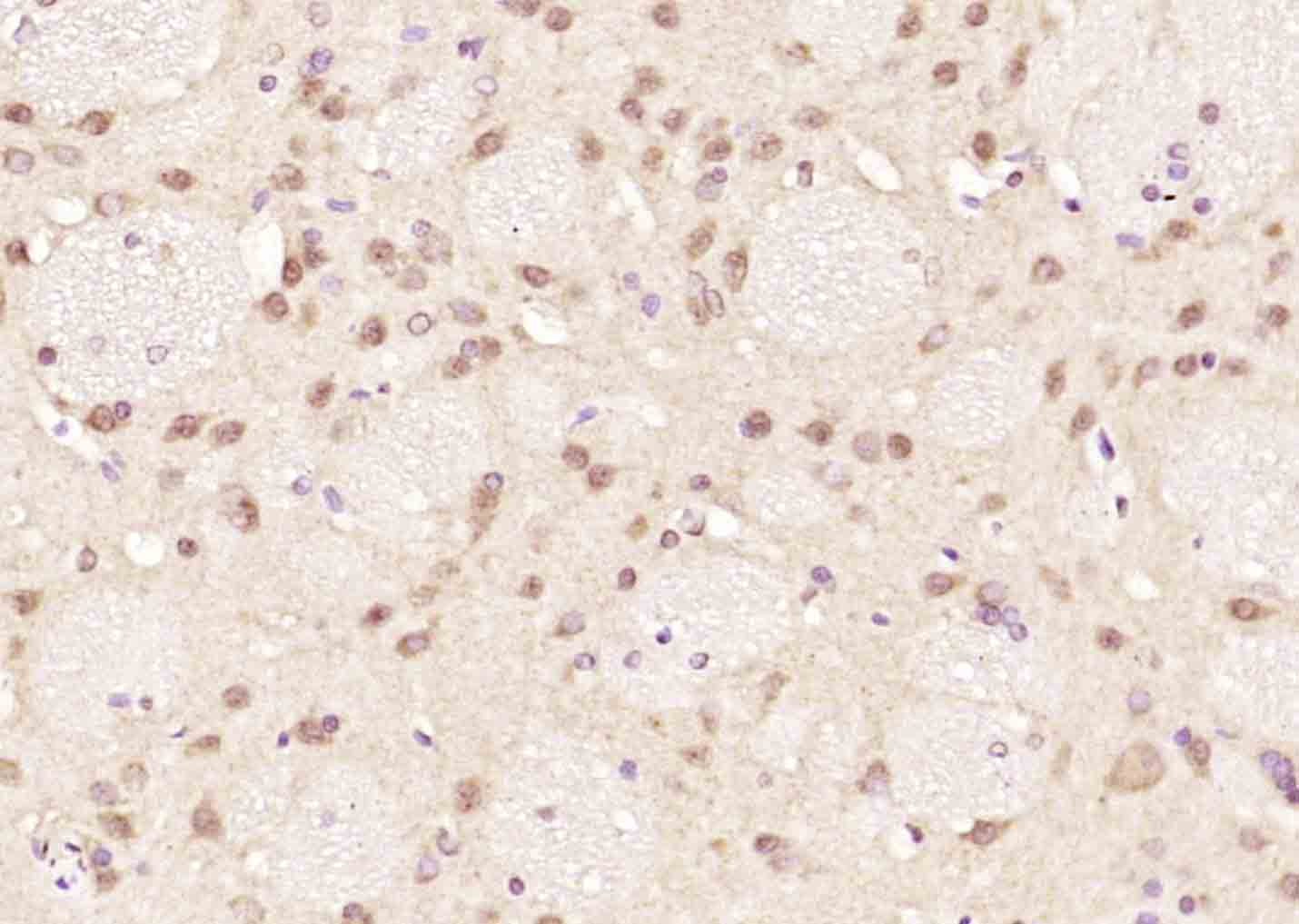 Paraformaldehyde-fixed, paraffin embedded (rat brain); Antigen retrieval by boiling in sodium citrate buffer (pH6.0) for 15min; Block endogenous peroxidase by 3% hydrogen peroxide for 20 minutes; Blocking buffer (normal goat serum) at 37°C for 30min; Antibody incubation with (PSF2) Polyclonal Antibody, Unconjugated (bs-7824R) at 1:200 overnight at 4°C, followed by operating according to SP Kit(Rabbit) (sp-0023) instructionsand DAB staining.