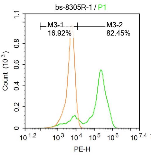U-937 cells were fixed with 4% PFA for 10min at room temperature,permeabilized with 90% ice-cold methanol for 20 min at room temperature, and incubated in 5% BSA blocking buffer for 30 min at room temperature. Cells were then stained with LYL1 Antibody(bs-8305R)at 1:100 dilution in blocking buffer and incubated for 30 min at room temperature, washed twice with 2%BSA in PBS, followed by secondary antibody incubation for 40 min at room temperature. Acquisitions of 20,000 events were performed. Cells stained with primary antibody (green), and isotype control (orange).