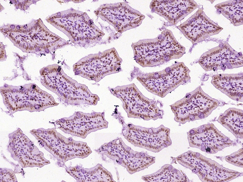 Paraformaldehyde-fixed, paraffin embedded (Mouse intestine); Antigen retrieval by boiling in sodium citrate buffer (pH6.0) for 15min; Block endogenous peroxidase by 3% hydrogen peroxide for 20 minutes; Blocking buffer (normal goat serum) at 37°C for 30min; Antibody incubation with (EGR3) Polyclonal Antibody, Unconjugated (bs-6448R) at 1:400 overnight at 4°C, followed by operating according to SP Kit(Rabbit) (sp-0023) instructionsand DAB staining.
