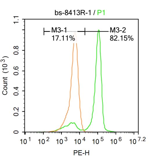 U-937 cells were fixed with 4% PFA for 10min at room temperature,permeabilized with 90% ice-cold methanol for 20 min at room temperature, and incubated in 5% BSA blocking buffer for 30 min at room temperature. Cells were then stained with Galectin 12 Antibody(bs-8413R)at 1:100 dilution in blocking buffer and incubated for 30 min at room temperature, washed twice with 2%BSA in PBS, followed by secondary antibody incubation for 40 min at room temperature. Acquisitions of 20,000 events were performed. Cells stained with primary antibody (green), and isotype control (orange).