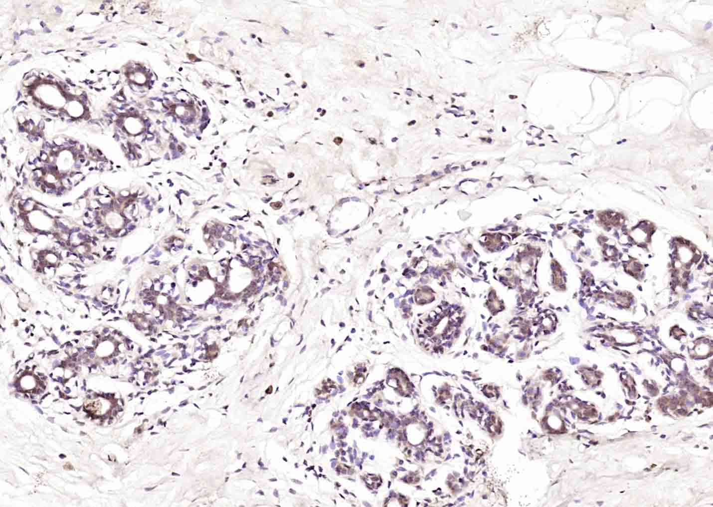 Paraformaldehyde-fixed, paraffin embedded (human breast); Antigen retrieval by boiling in sodium citrate buffer (pH6.0) for 15min; Block endogenous peroxidase by 3% hydrogen peroxide for 20 minutes; Blocking buffer (normal goat serum) at 37°C for 30min; Antibody incubation with (Galectin 12) Polyclonal Antibody, Unconjugated (bs-8413R) at 1:200 overnight at 4°C, followed by operating according to SP Kit(Rabbit) (sp-0023) instructionsand DAB staining.