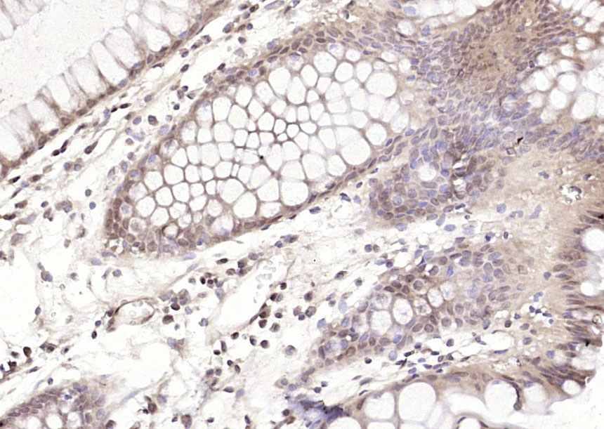 Paraformaldehyde-fixed, paraffin embedded (human colon carcinoma); Antigen retrieval by boiling in sodium citrate buffer (pH6.0) for 15min; Block endogenous peroxidase by 3% hydrogen peroxide for 20 minutes; Blocking buffer (normal goat serum) at 37°C for 30min; Antibody incubation with (ROC1 RNF75) Polyclonal Antibody, Unconjugated (bs-8391R) at 1:200 overnight at 4°C, followed by operating according to SP Kit(Rabbit) (sp-0023) instructionsand DAB staining.